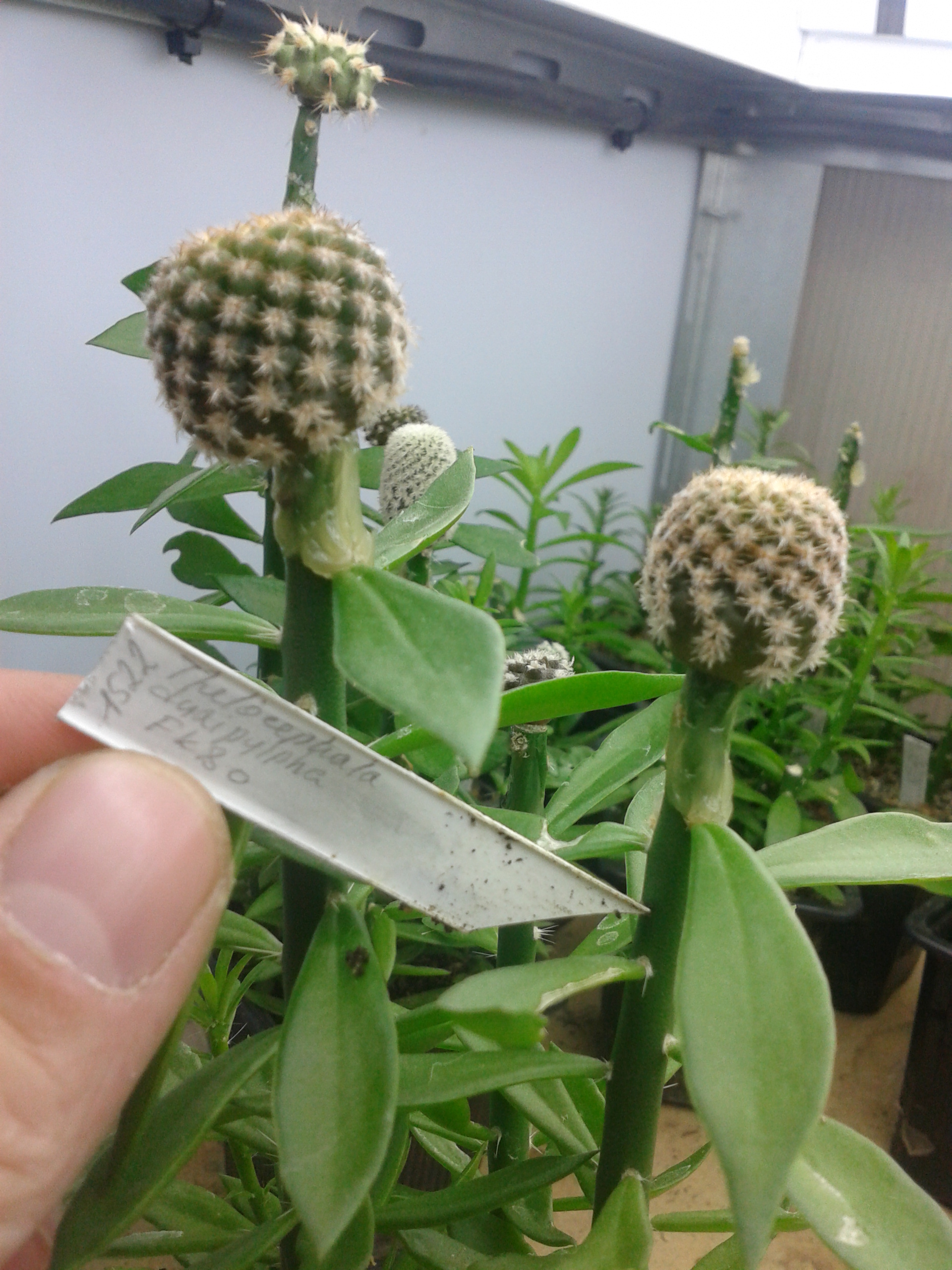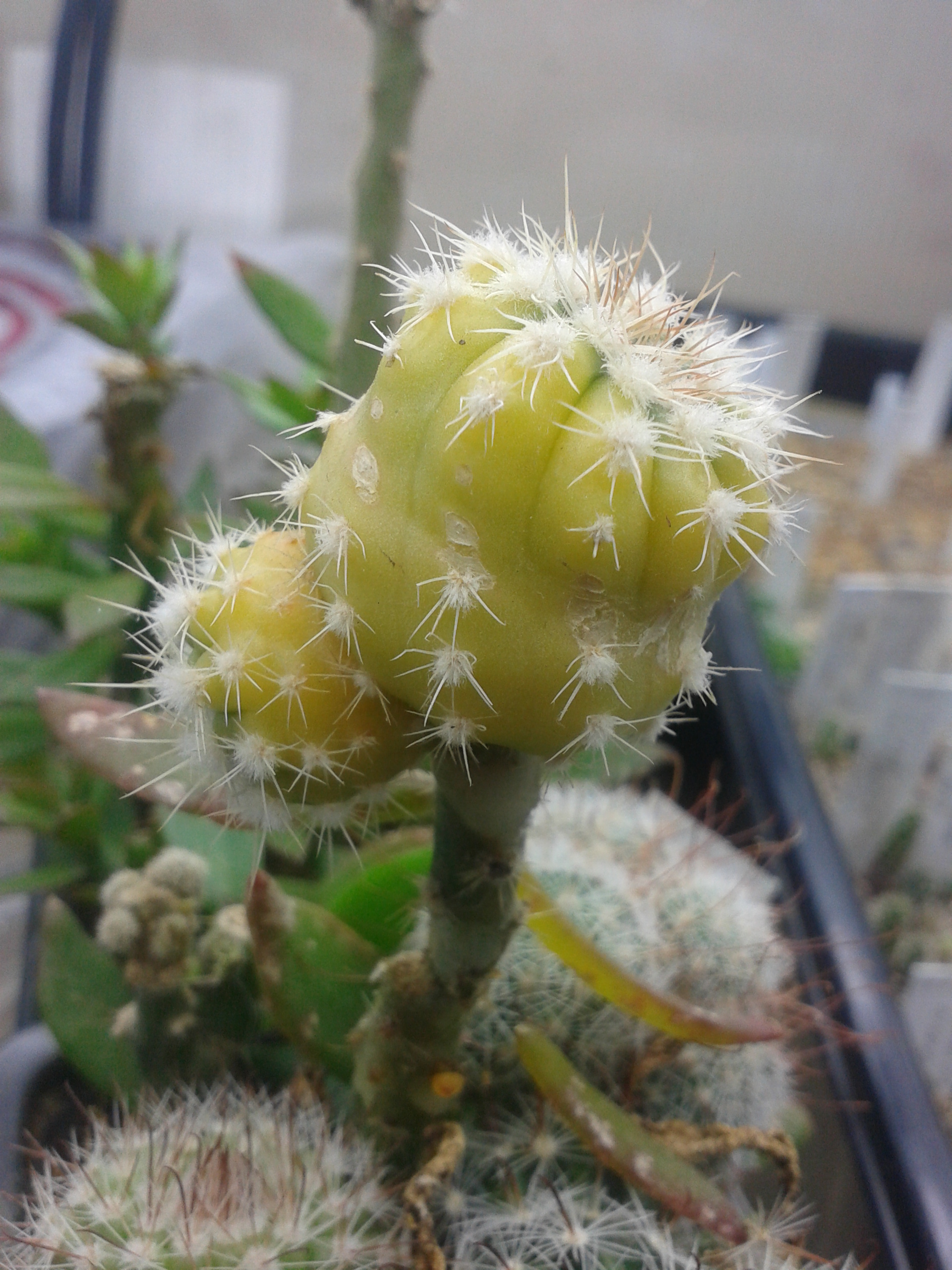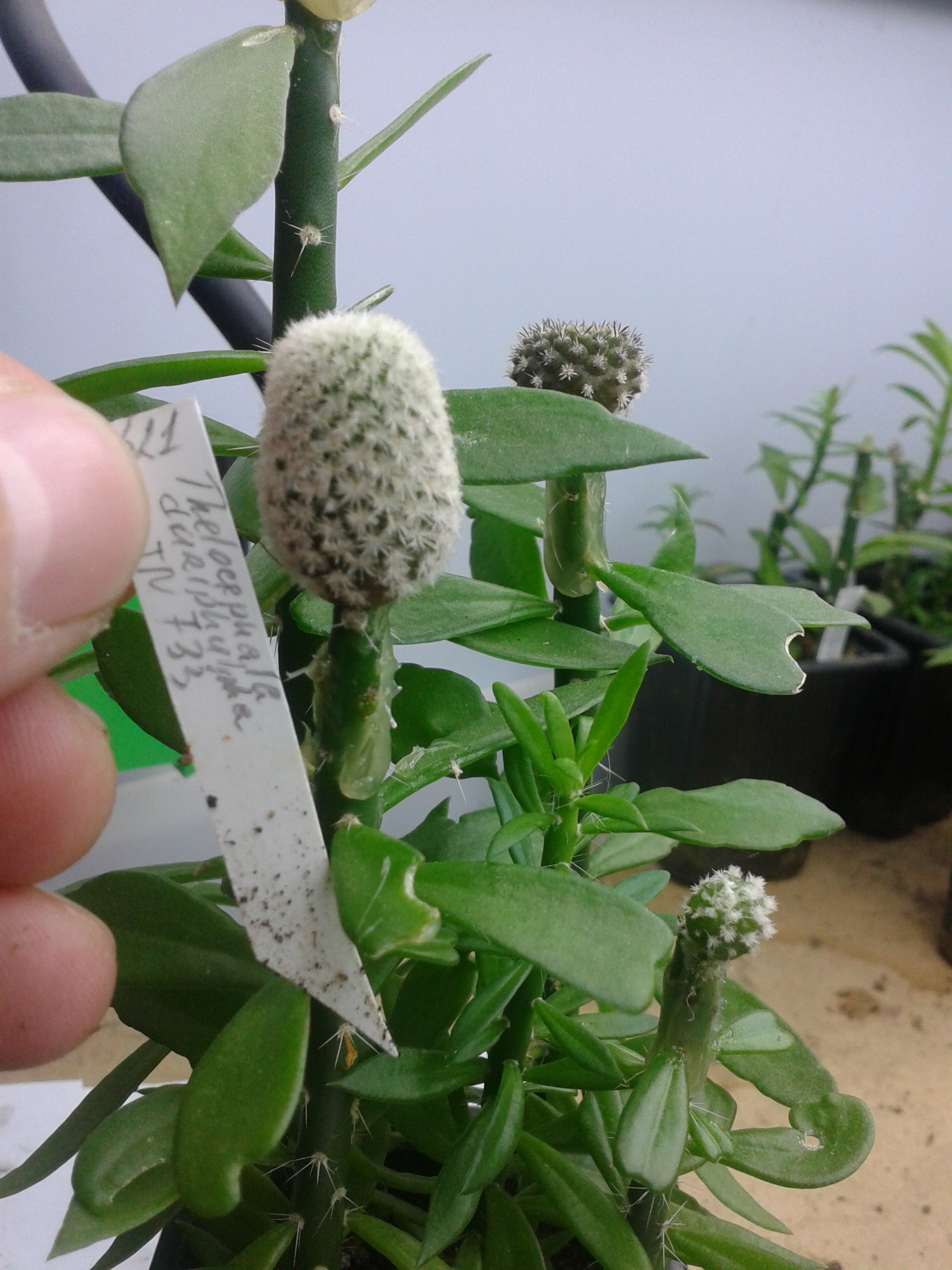 Здесь скорее внутривидовая изменчивость,а так,замечательные Thelocephala duripulpa JN733 Atacama,Aqua de Luna.Имея от природы короткоцилиндрическую форму,эти растения пожалуй наиболее склонны к вытягиванию при недостатке света,особенно сильно это проявляется в конце зимы.