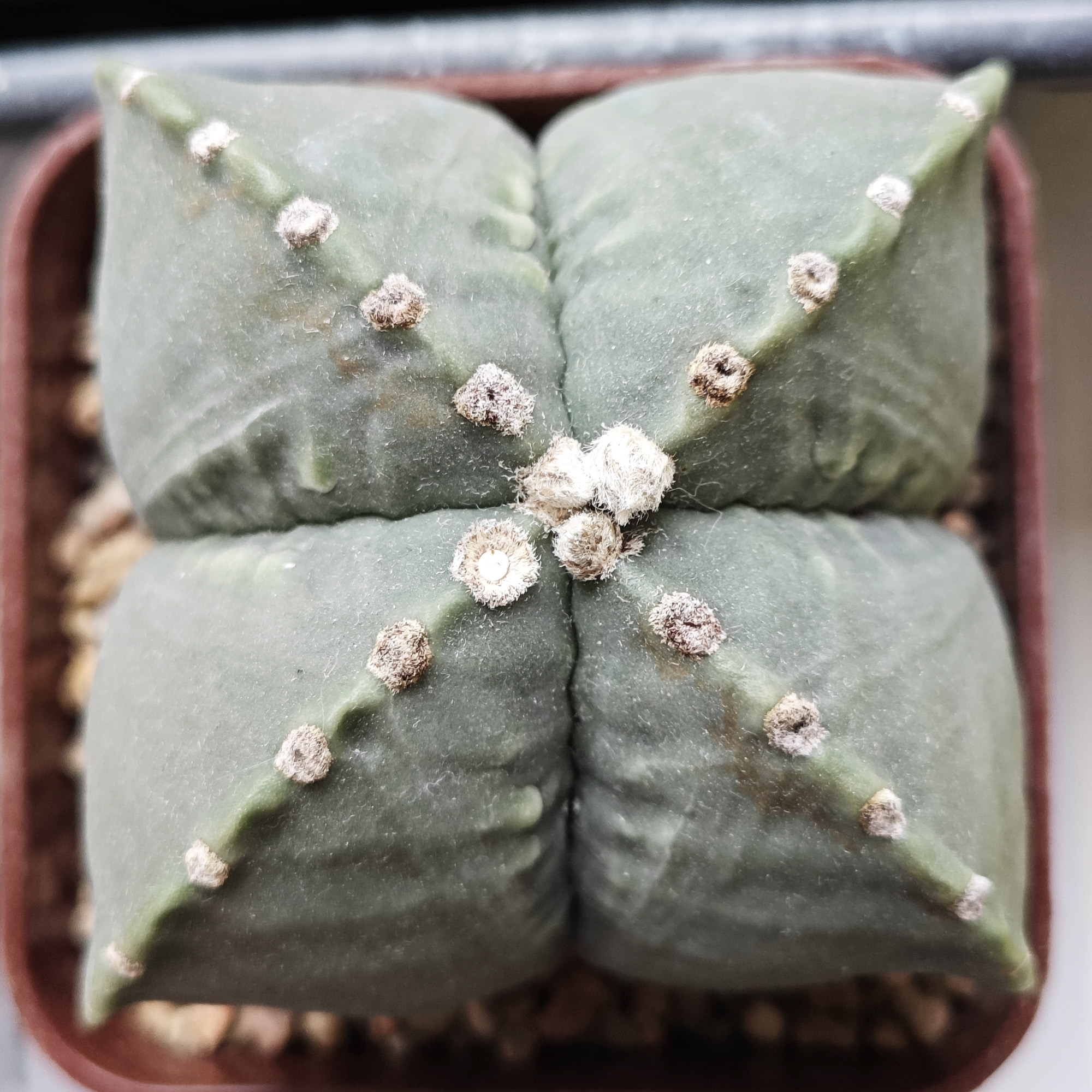 Немного необычный экземплярчик Astrophytum myriostigma var. quadricostatum f. nudum. Что у него между рёбрами то творится!?