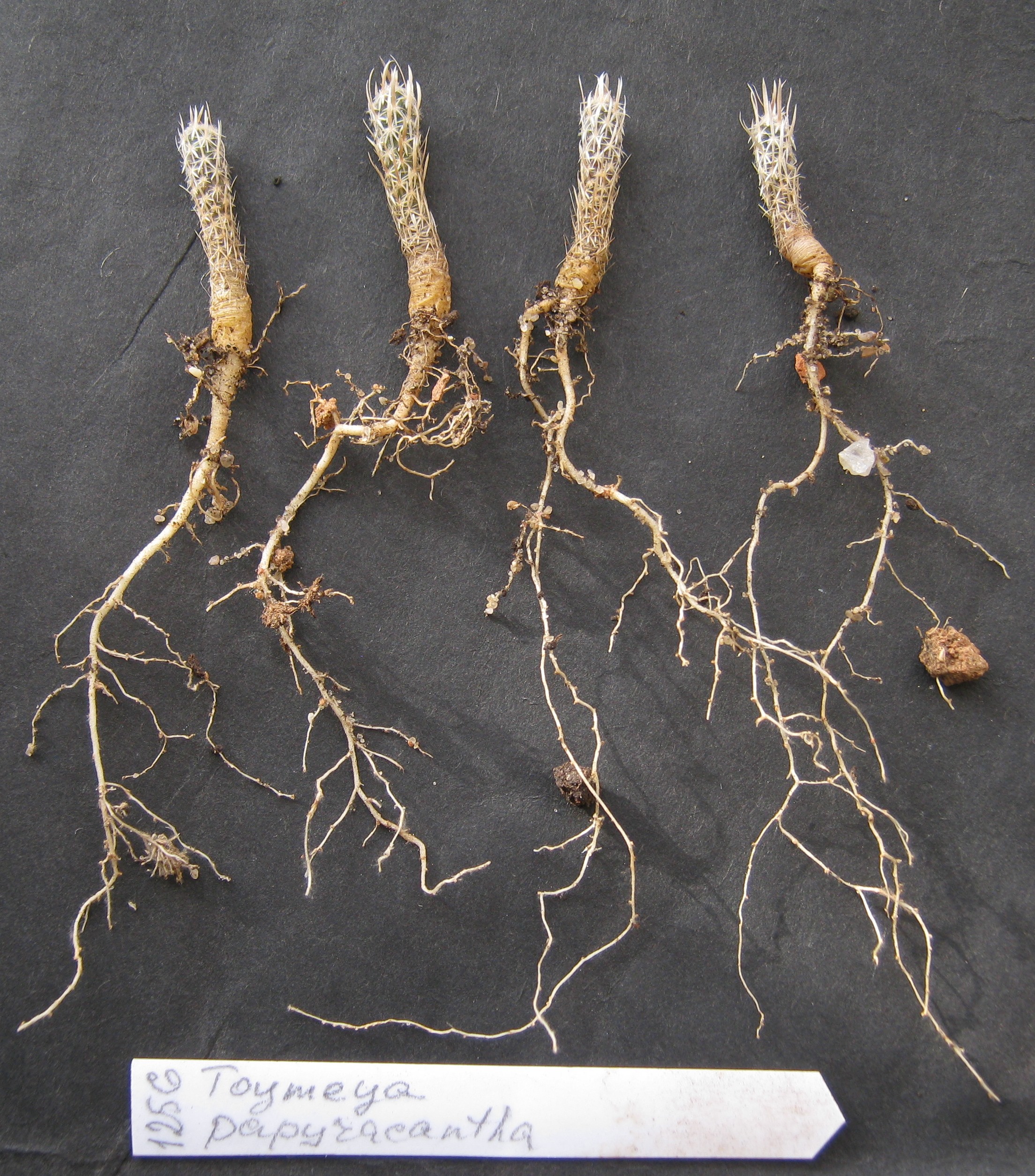 Сеянцам тумии в январе будет два года. Не знаю насколько полезна будет моя демонстрация сеянцев, но меня заинтересовала длина корешков. Они росли, если это можно назвать ростом >:o, в песчаном субстрате, где его доля составляла 7 частей, остальное земля из леса, кирпичная крошка и чуть красной глины. Песок из карьера, не просеянный. В принципе в этом и была задумка, чтобы избавить себя от изнуряющего просеивания и промывки. Однако, несмотря на чистые корни и отсутствие проблем с четырьмя сеянцами тумии с момента их появления, им всё-таки не хватало питания. Иначе отчего такие длиннющие корни? Мало было влаги или вытянулись в поисках питания. Думаю, что и то, и другое. Росли тумии в общем горшке 10х10 см вместе с необессиями, эпителантами, гимнокактусами и гимнокалициумами дамсии. Последние были красные и тоже слабо росли. Летом в жару вода быстро испарялась с широкой поверхности горшка и очевидно задерживалась в нижних слоях. Пусть не надолго, но корешки стремились к влаге.  Сейчас поменял им субстрат на более питательный и каждому сеянцу предоставил отдельный маленький горшочек. Посмотрим, как поведут себя в следующем сезоне.