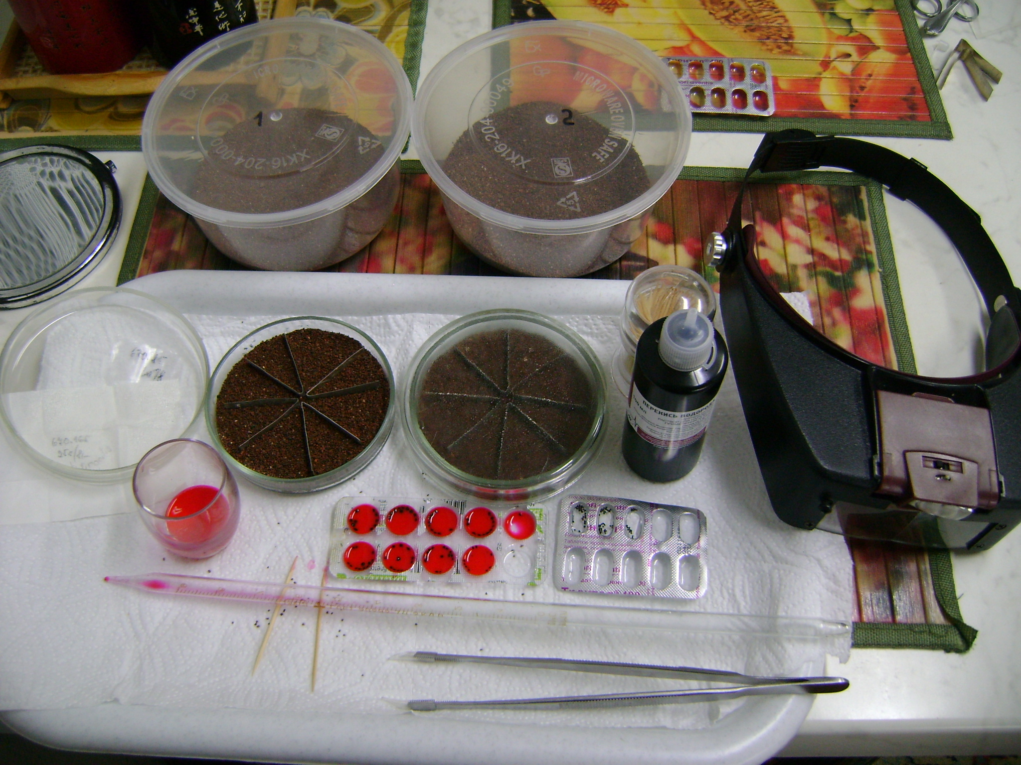 Сеянцы находятся под лампами ЛБ 40 на растоянии  0,5 - 1,0 см . Температура 25 - 28 градусов . Подсветка  включается таймером с 8 до22 часов . Смесь - 50% мелкого керамзита 1 -2мм , 30% крупнозернистого песка , 20%просеяного торфа( из пакетов "" Кактусы"" в магазине .