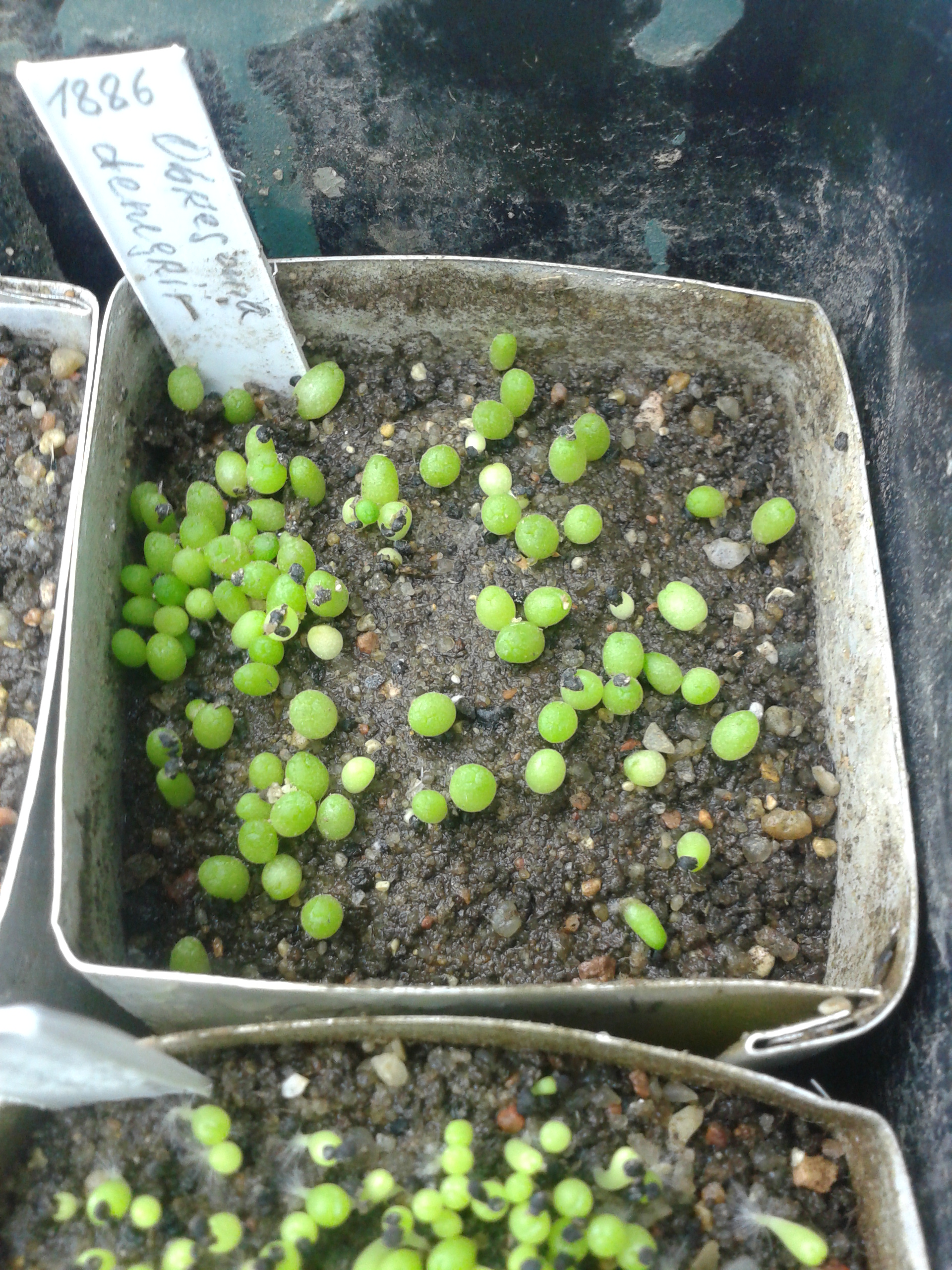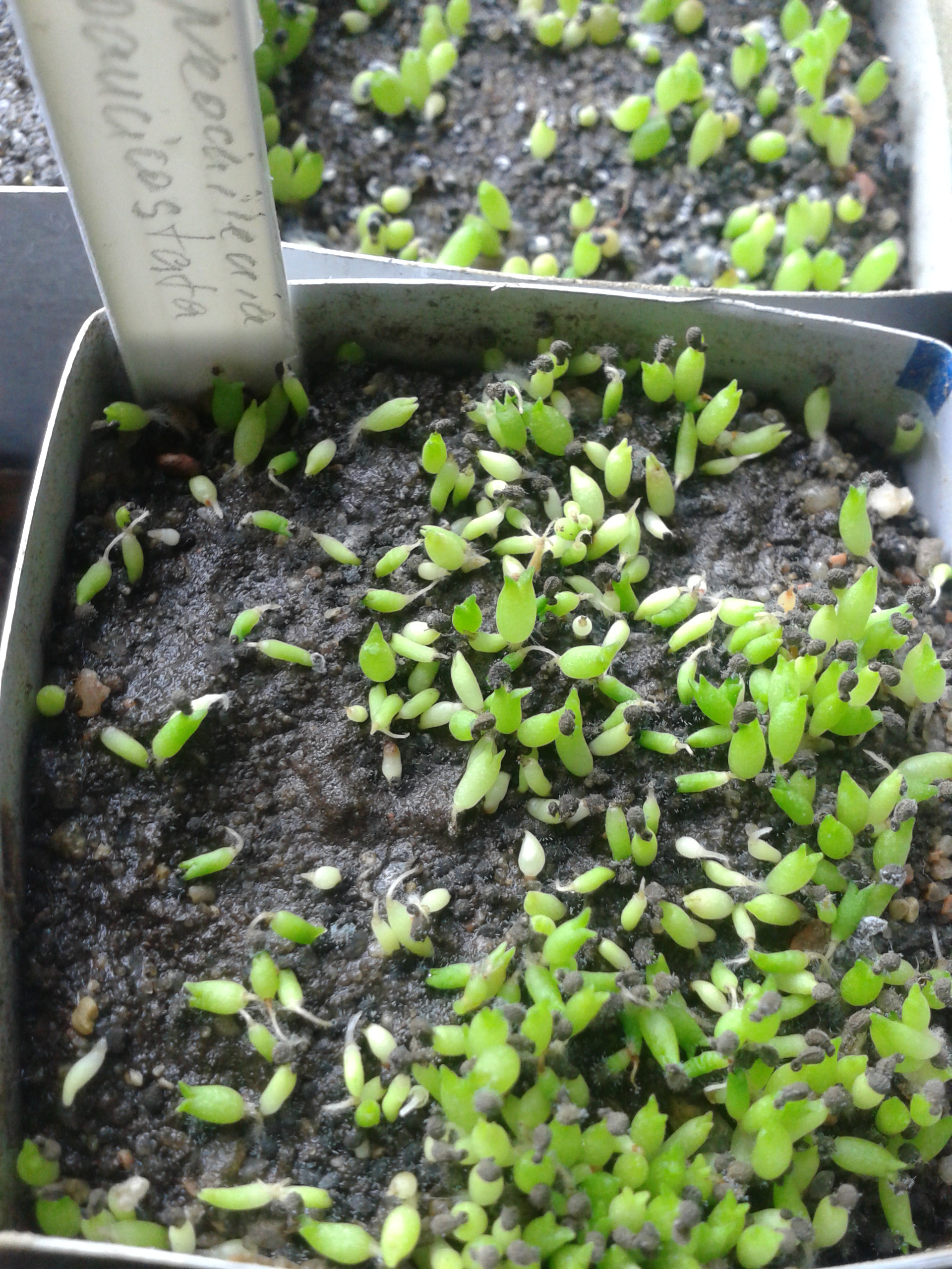 Может не совсем в тему.  2-недельные адениумы. Из 8 семян взошло 7  :) Взошли не ровно. Разное опыление, по 2 шт. разные сорта. Семена не мои