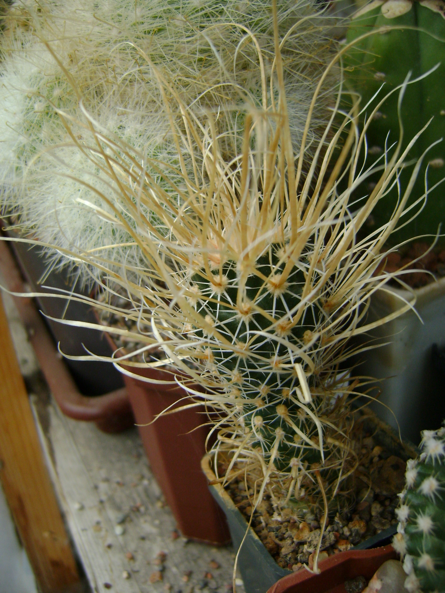 Чуть порылся в архиве, чтобы показать, что не только у меня сосиски произрастают. Верхнее - это еще одна моя, а нижнее фото- это кактусы из коллекции А. Острикова. Я эту коллекцию показывал, но данное фото не вошло в показ. К сожалению фото достаточно панорамное, а разрешение никудышнее. Но видно, что в дальнем правом углу покатом лежат "волосатые  сосиски". Это папироканты.