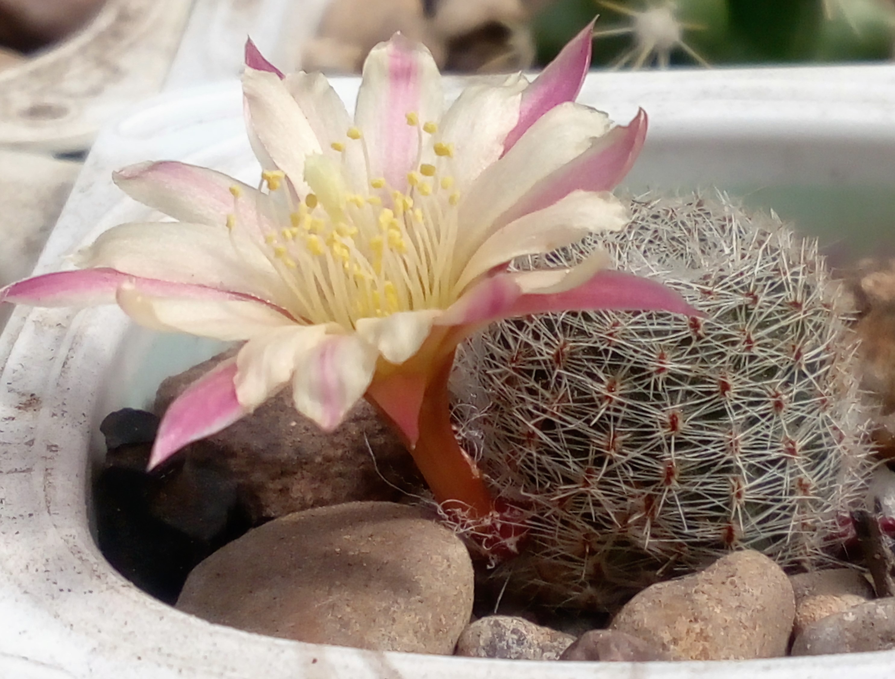 Здесь Astrophytum myriostigma, но мне больше напоминает Astrophytum coahuilense. Снизу "бедная" Mammillaria spinosissima. :(