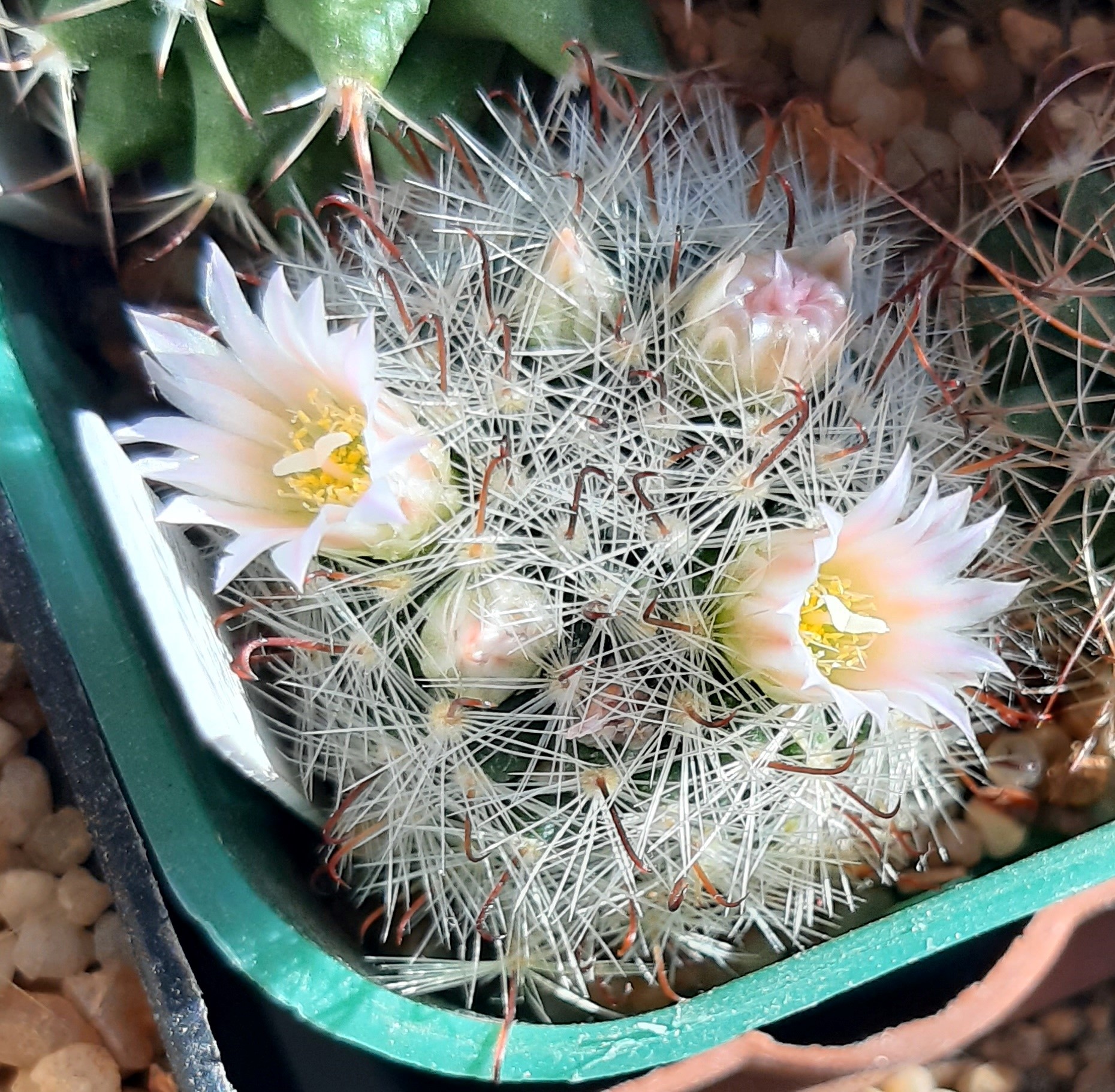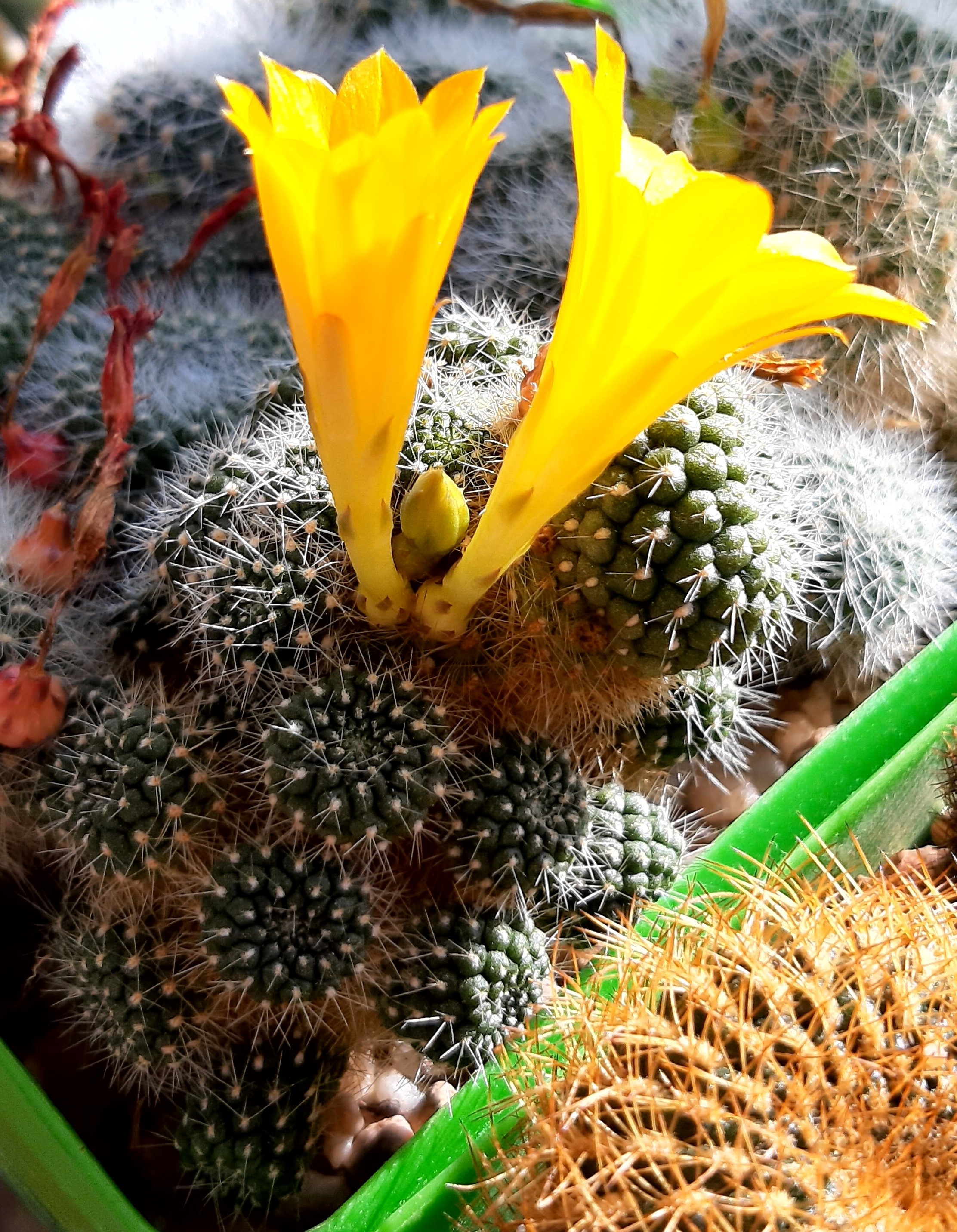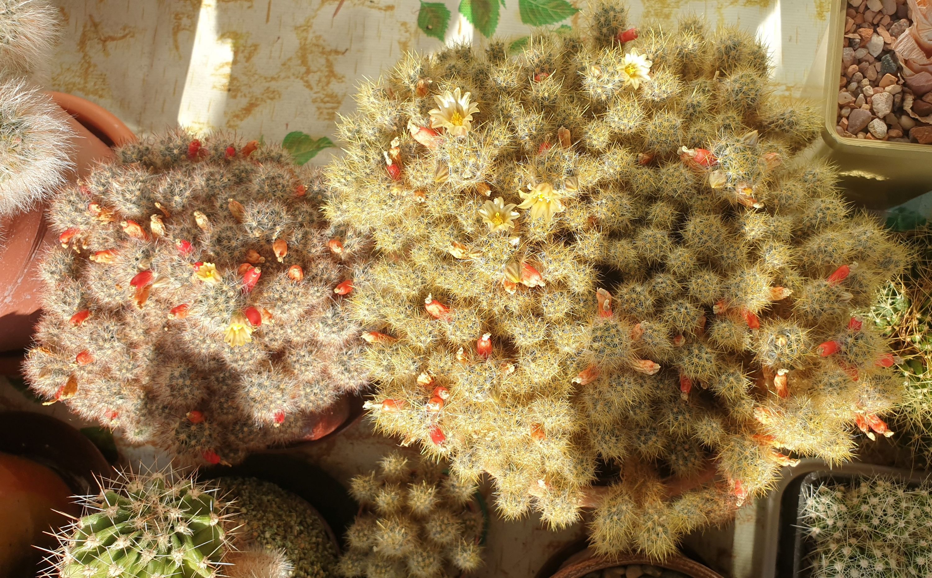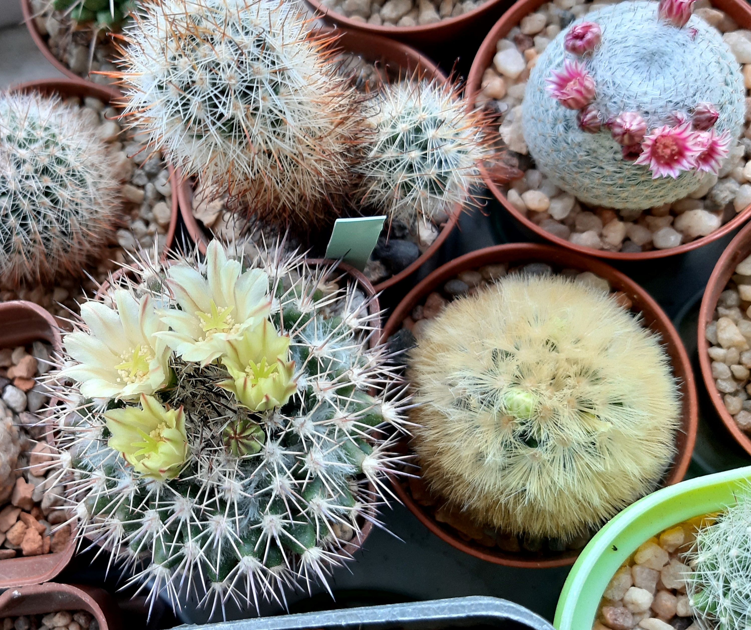Слева внизу – Mammillaria flavovirens (привет уважаемому viache!), справа вверху – Mammillaria pseudoperbella