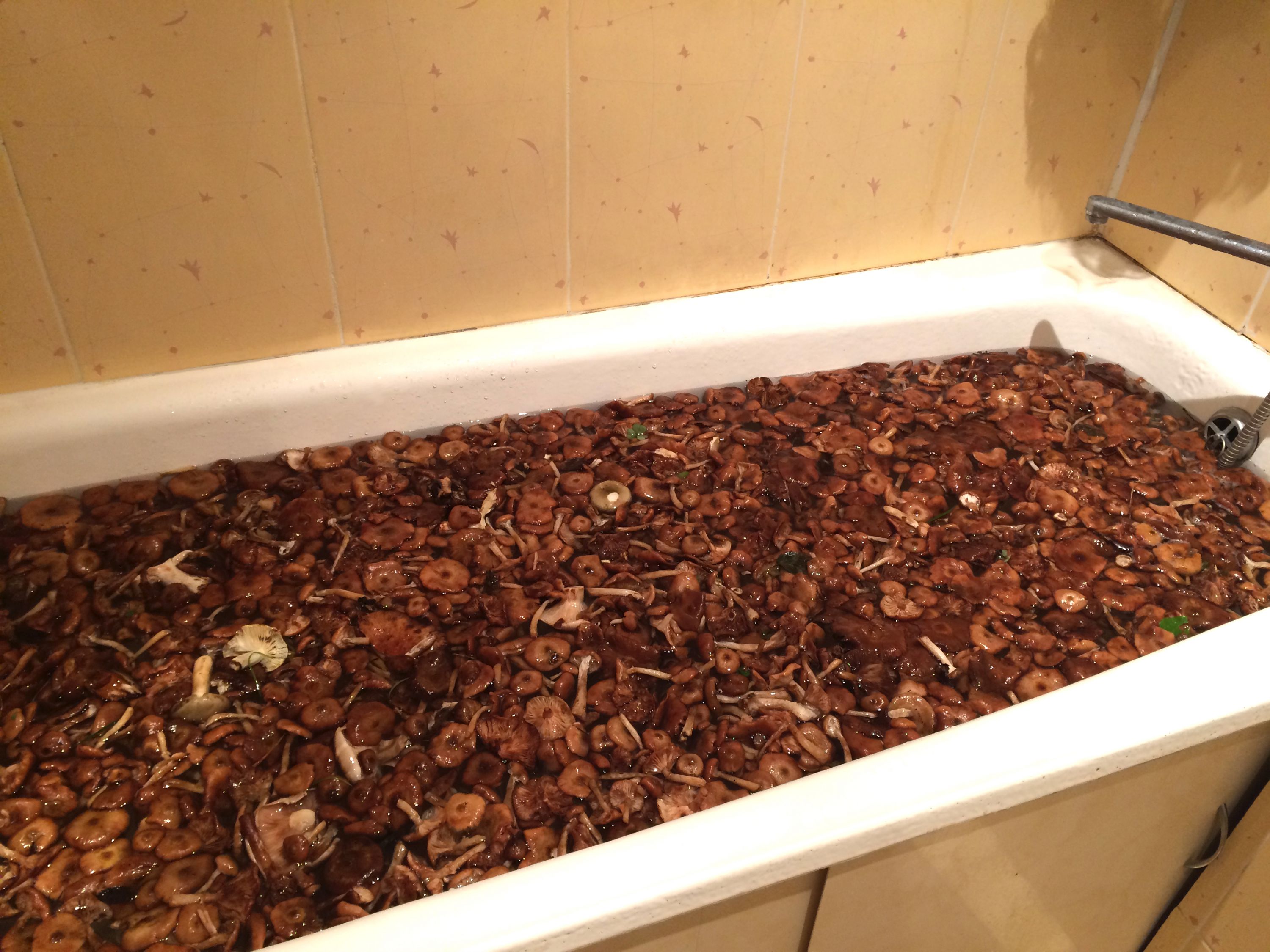 Ванна не полная на самом деле. В ней всего-то два ведра опят. Это я их купаю перед чисткой-варкой-заморозкой  :)