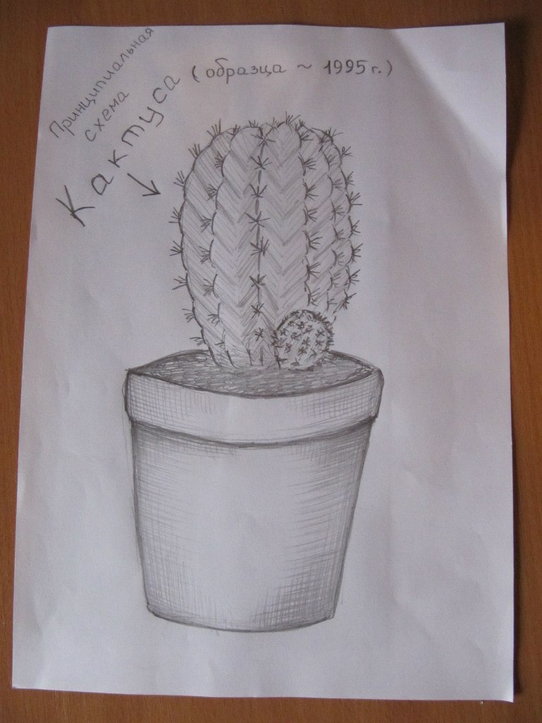 Итак, сначала  был кактус. Один. Как позже выяснилось - эхинопсис. И было это (о, ужас!) аж четверть века назад, а посему документальных свидетельств не сохранилось.  :-x Из фототехники был один плёночный kodak-полуавтомат, на который снимались только особенно важные события. Это вот сейчас я понимаю, что кактус (пусть и эхинопсис) - это и есть особенное событие. А тогда, будучи 8-илетним ребёнком, не понимала. В общем, за неимением фото, могу приложить только экземпляр наскальной живописи. Дальше (как в том анекдоте, кстати, тоже про любовь) будут слайды.  :)  Вот примерно таким был мой первый кактус: