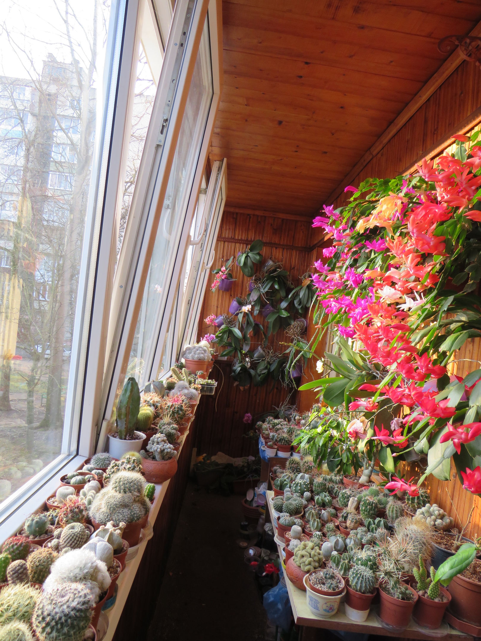 Живут мои колючие питомцы на утеплённой специально для них лоджии восточной ориентации. На лето часть коллекции выезжала на дачу на южное окошко наращивать особо могучие колючки и густую "шерсть". Зимуют все на лоджии. С учётом открытой двери в комнату температура там даже возле самого окна и при -30 на улице не опускается ниже +5. Дальше от окна и в менее морозные дни она, конечно, немного выше. А эту зиму так и вообще форточки редко закрывались. :) После такой зимовки на лоджии многие кактусята впервые порадовали цветением и с каждым годом число радующих растёт.  '] Вместе с кактусами на лоджии обитают орхидеи, адениумы, фиалки, лимон, шеддок, мандарин и лесные кактусы.