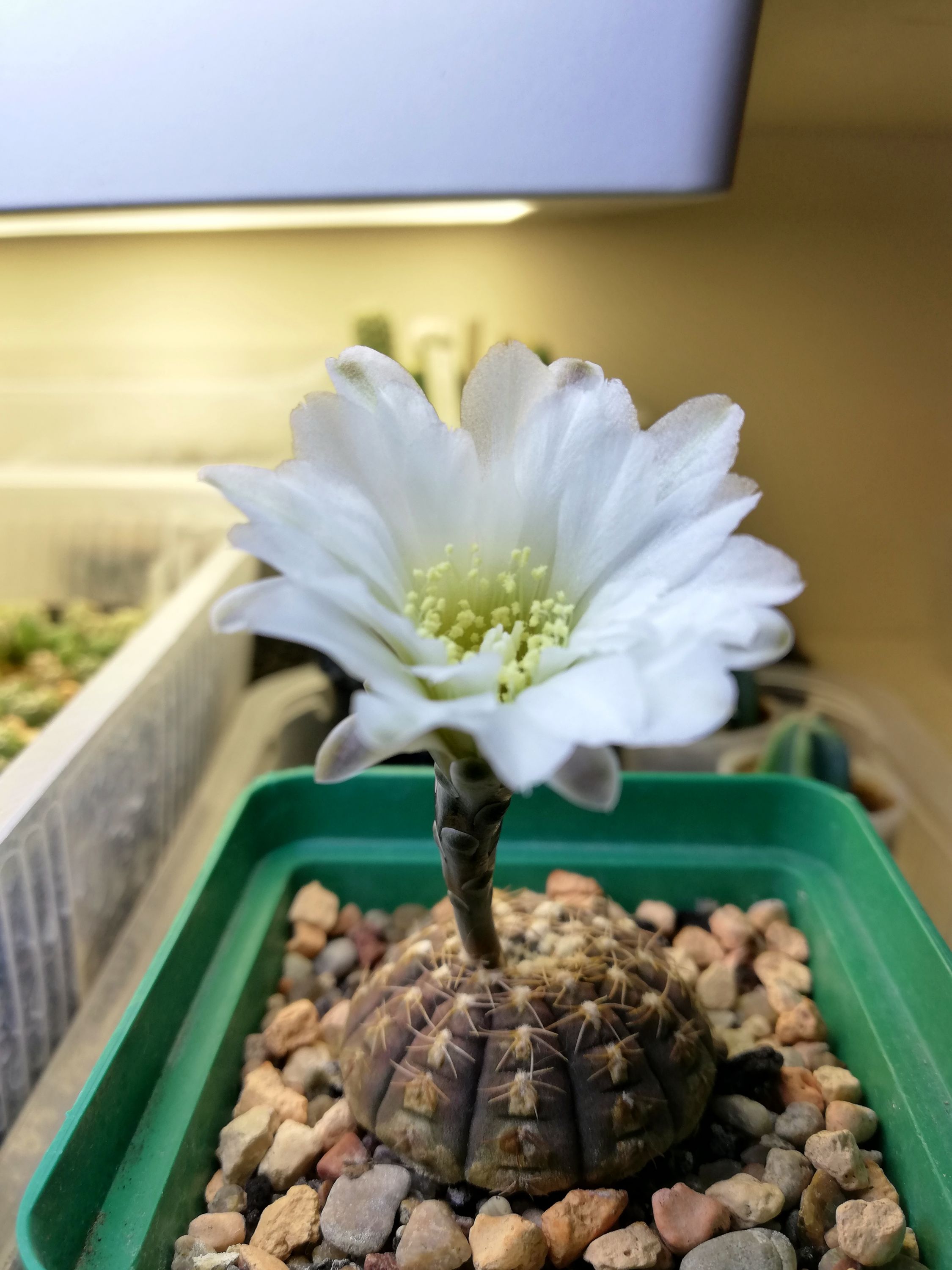 С Новым годом! Подгадал зимнее цветение Turbinicarpus bonatzii, San Bartolo. 31.12.2020 полностью созрел бутон, а утром 1.01.2021 раскрылся цветок. Первый праздничный залп салюта пошел!