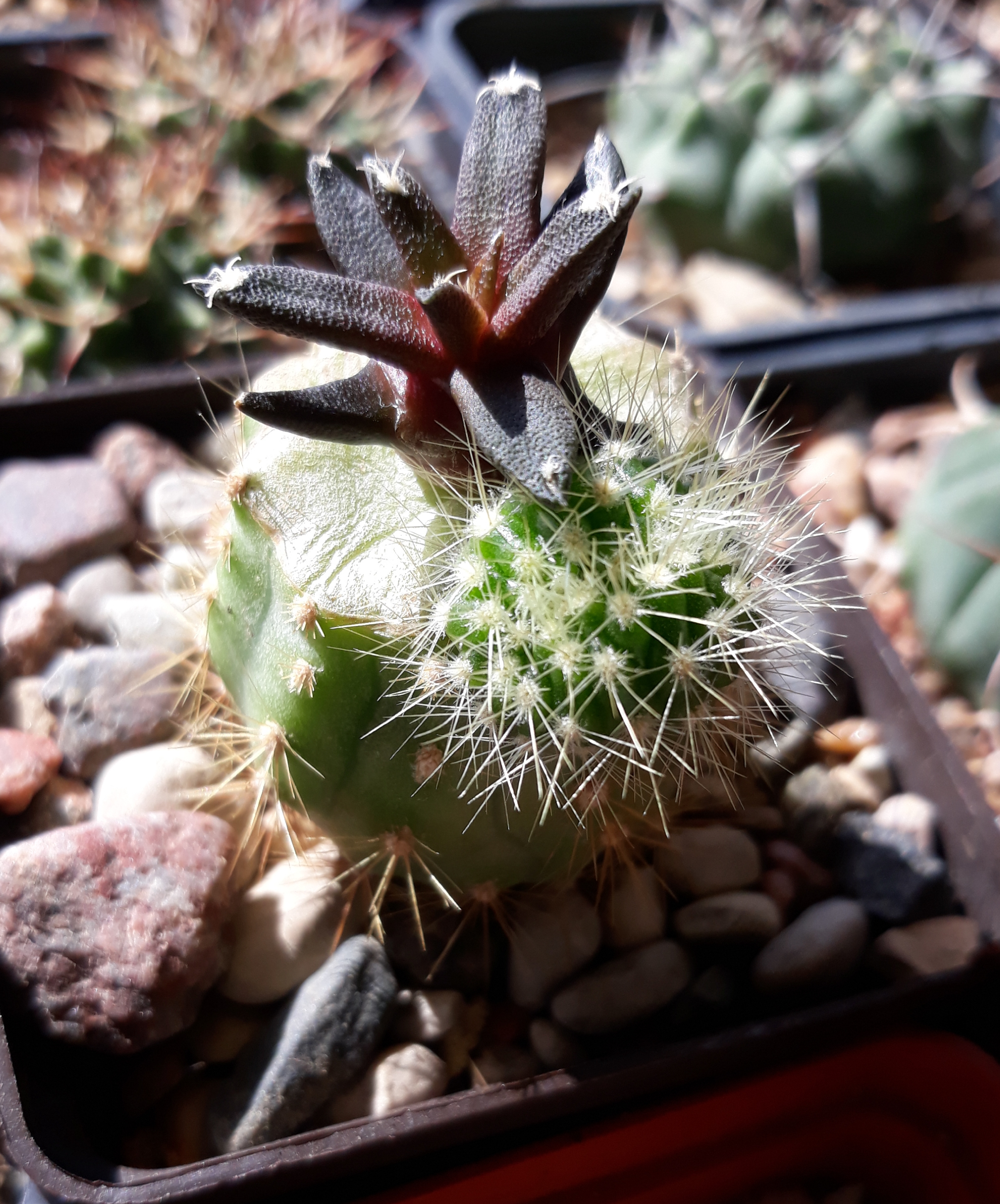В советские времена Echinocereus knippelianus считался ценным кактусом в коллекциях, довольно прихотливым и теплолюбивым, поэтому его старались привить. Тоже самое и я проделал со своим сеянцем в 90-ых годах. Раз теплолюбивый, значит я его всегда забирал на зимовку в квартиру. Этой зимой я забыл про него и он зимовал с другими "холодолюбивыми" кактусами в сарае. Ничего, всё прошло нормально. К тому же снизу у подвоя (Echinocereus penthalophus) выросло вот это... Похоже на бутон, подумал я и не ошибся. :) Одревесневевший подвой  выдал бутон, вместо обычной детки в разрыв ареолы.