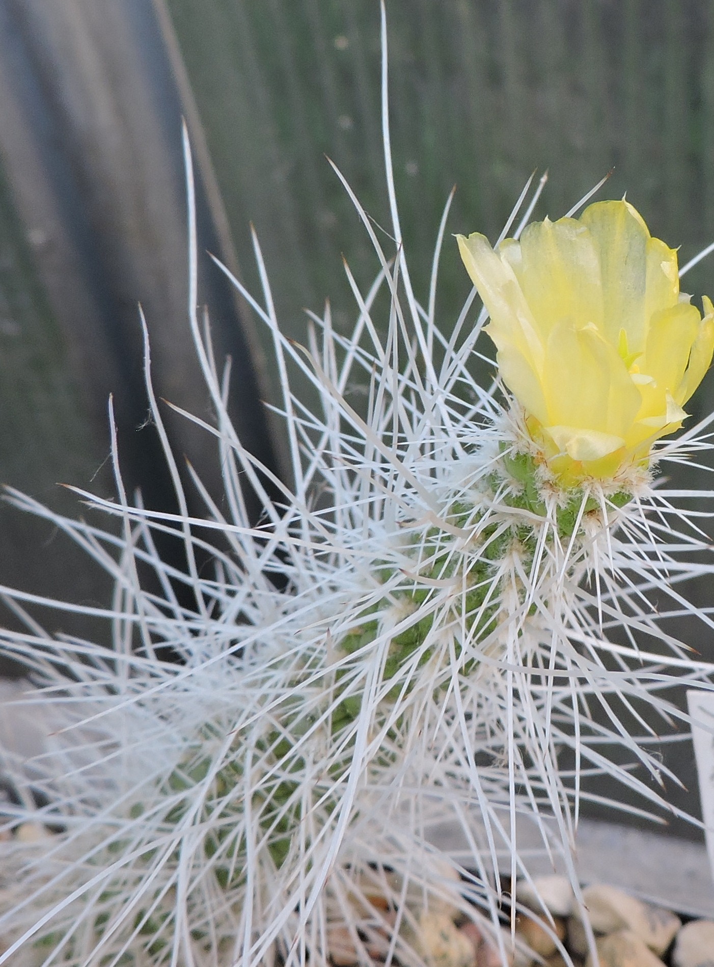 Очередной нежданчик. ':/ Вроде дело к зиме спать пора, а тут на те в первый раз. Всего то в высоту около 8 см, а в диаметре худющий 1.5 см около. Tephrocactus weberii VG 1134 сеял в середине марта 2012 года.