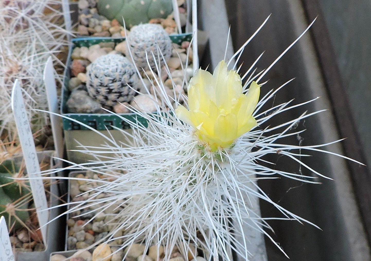 Очередной нежданчик. ':/ Вроде дело к зиме спать пора, а тут на те в первый раз. Всего то в высоту около 8 см, а в диаметре худющий 1.5 см около. Tephrocactus weberii VG 1134 сеял в середине марта 2012 года.