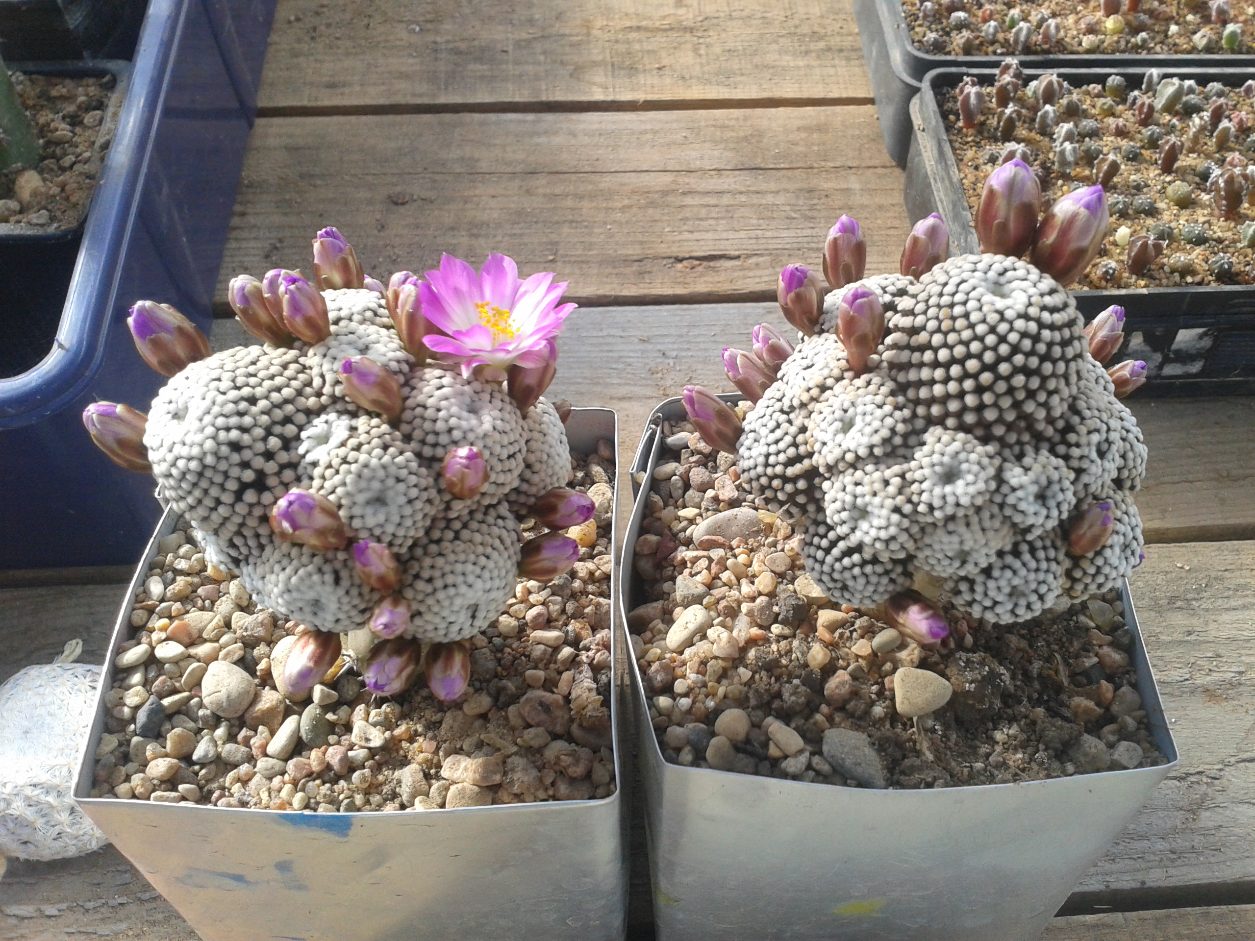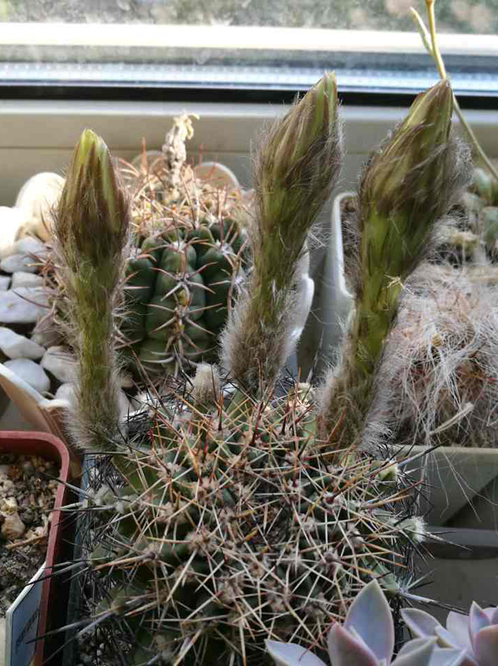 Сегодня увидела, что бутоны жёлтые, и поняла, что перепутала. Эхинопсисы-эспэшки у меня с розовыми и бело-розовыми цветками. Да и по бутонам видно: у Lobivia aurea цветонос более короткий и толстый, да и развивается бутон гораздо быстрее.
