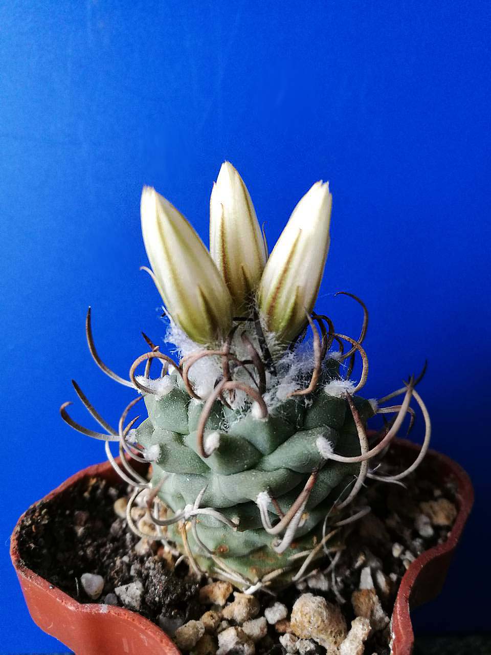 Tephrocactus molinensis пару недель назад обрезал. Ему видимо полегчало и он решил зацвести.