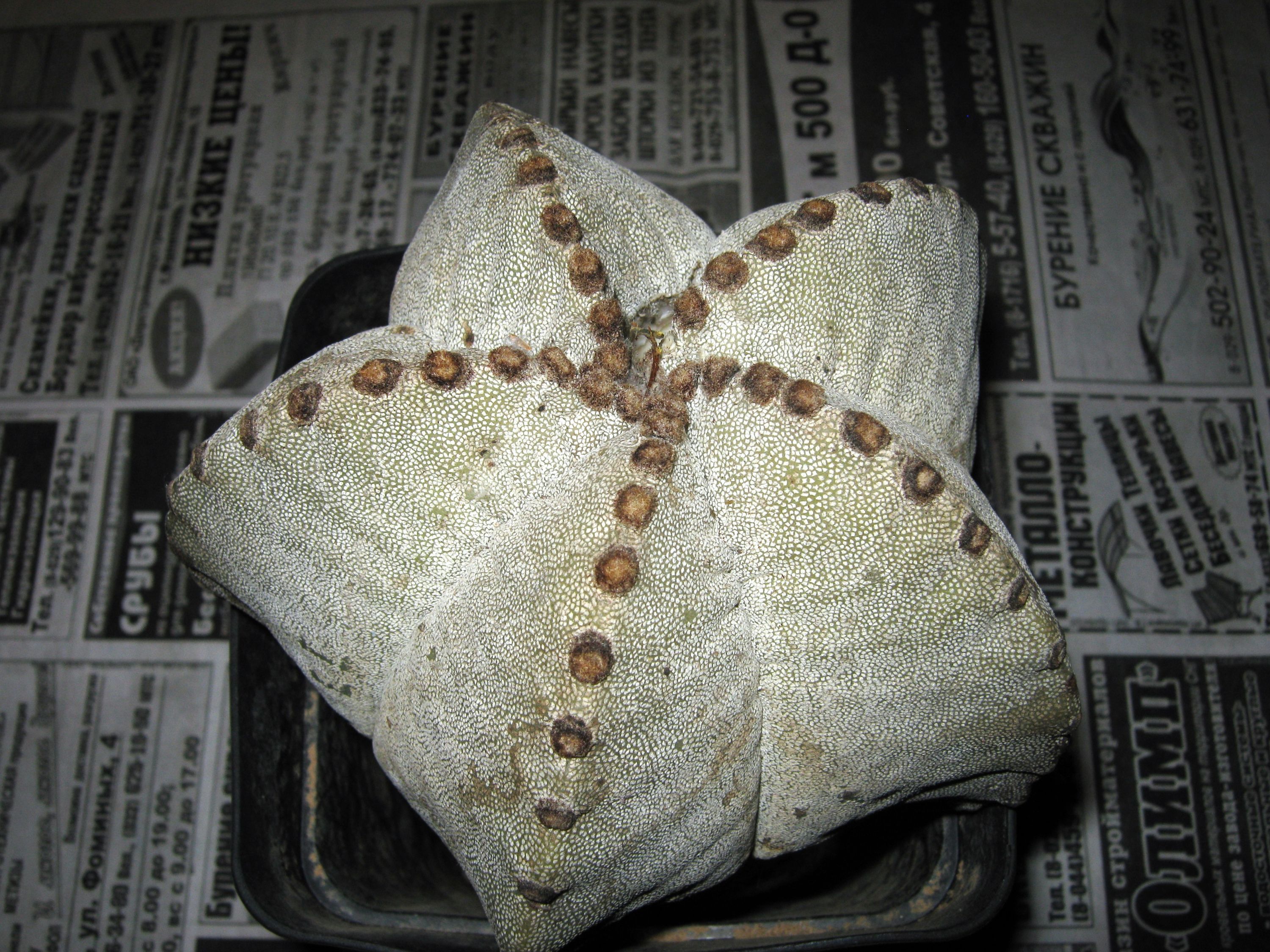 Очередная зимняя потеря. :( Astrophytum myriostigma стоял на зимовке возле кирпичной стены в общем поддоне, хотя был отгорожен листом картона. Температура воздуха обычно сейчас 2-6 градусов тепла. Вечером протапливаю до 22 градусов, но температура быстро падает до указанной мной ранее и держится на этом уровне до моей растопки. В сильные морозы при прояснениях держится в пределах 2-х градусов тепла. Вместе стояли три мириостигмы, все довольно старые по 10 см в диаметре. На одном из них заметил что-то неладное, но с видимой стороны было не особо заметно.