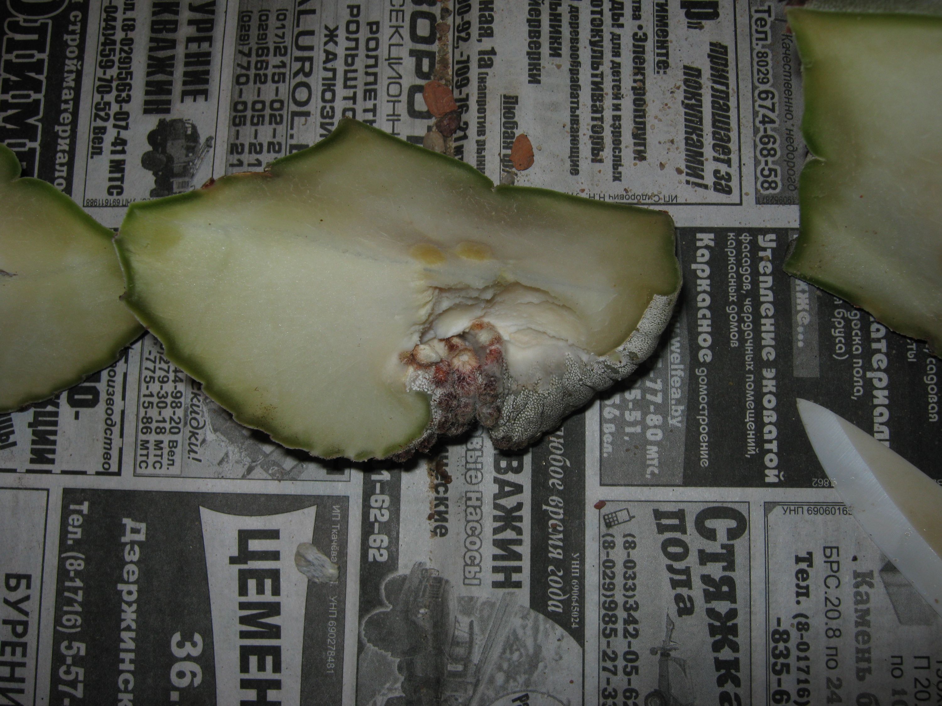 я конечно не знаток, но если бы видел только последнее фото то сказал  бы что у Вас очень странный подмерзший патиссон, как раз похожий на такой как я разрезал пару дней назад , по виду "травмы" очень уж схожи, а странный он потому что у него кожура какого то интересного окраса.