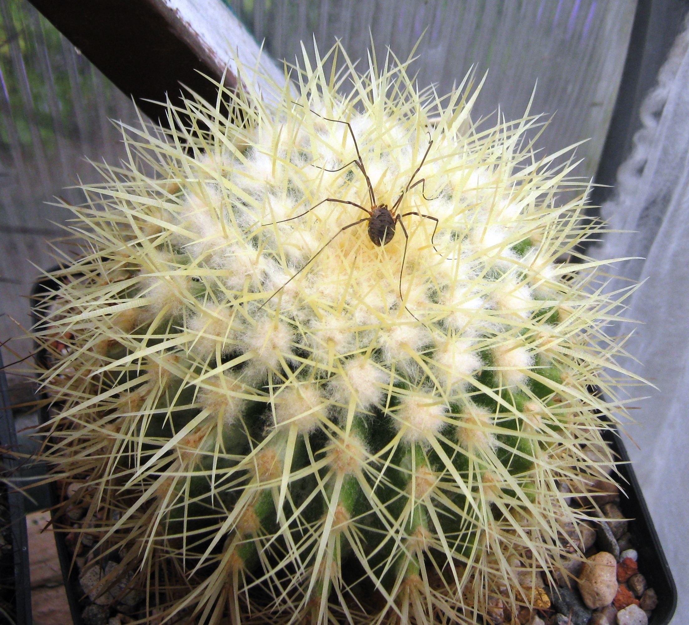 Тоже не хочу заводить новую тему о кактусах и пауках, пусть будут с кузнечиками. :) Вроде пауки не являются насекомыми, поэтому решил продолжить старую тему связанную с кактусами и насекомоподобными существами. Вчера днём застал сенокосца на эхинокактусе. Пригрелся в теплице.