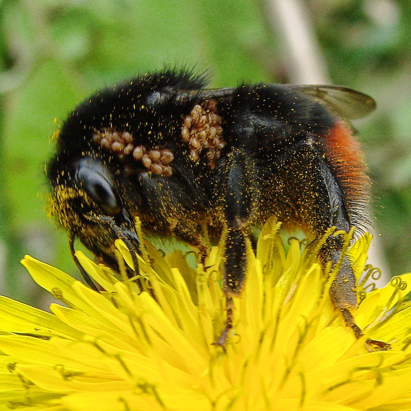 Шмель, поражённый гамазовым клещём. Жить Бедняге осталось несколько часов...