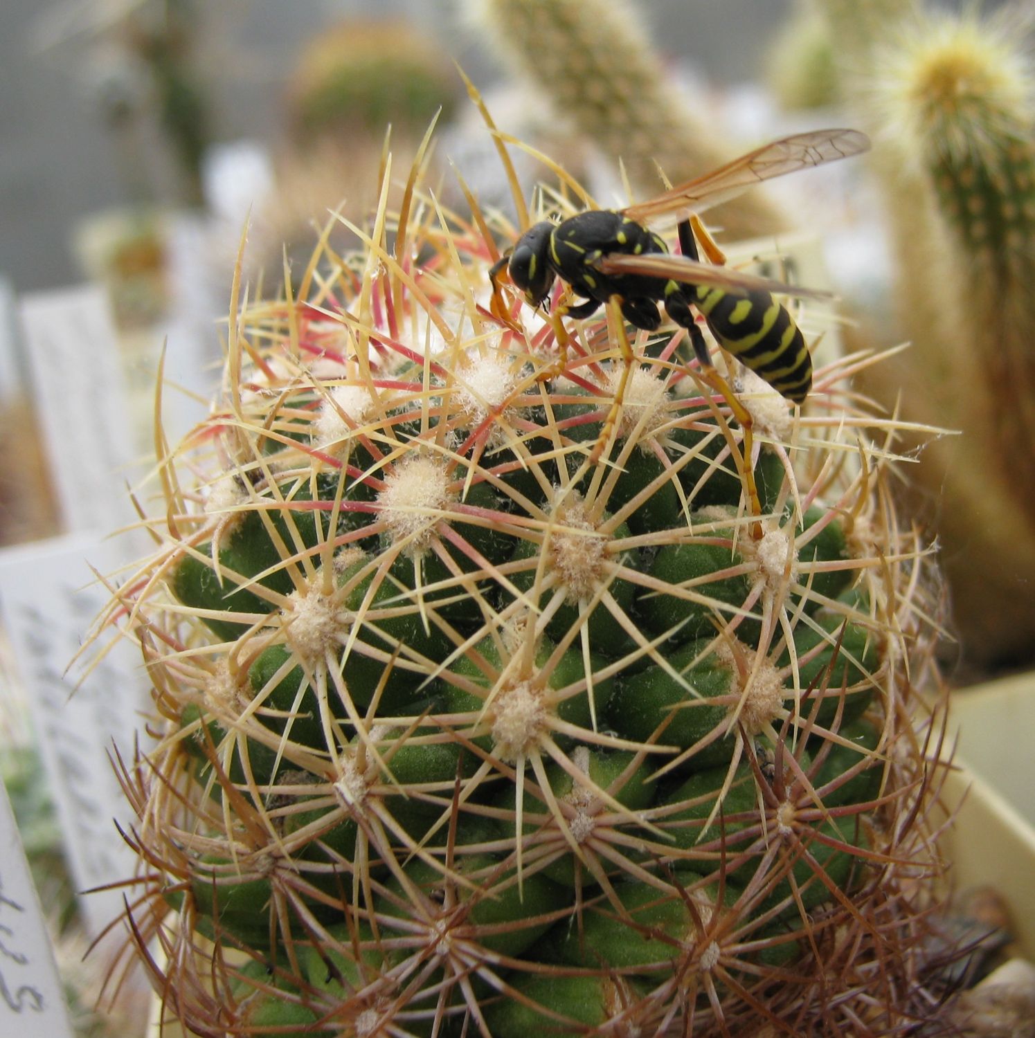 Оса-помощница, молодчина, делает за меня работу по уборке сахаристых выделений. Была замечена неделю или две назад, что-то у неё с крыльями, не может подняться в воздух. Чуть поднимется и падает, но бегает исправно по колючкам. Лазила по Aрахадоа, а потом перебралась на телокактус и мордочкой ткнулась в сиропчик. Застряла надолго, пока всё сладенькое не съела. Я потом её на ферокактус пинцетом перекинул, но она чего-то не очень сообразительная, так и не вьехала, что я ей добра хочу, чтоб поела, а она носится по колючкам, что угорелая и всё пыталась пинцет ужалить. :)