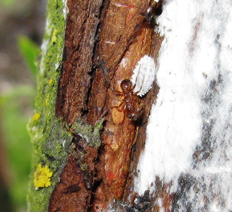 На днях оторвал кусок облупившейся коры на старой сливе, а под корой увидел вот такого "зверя"... :) Очень он мне напомнил мучнистого червеца. Не он ли случайно? Муравьи его пасут и щекочут усиками, наверное хотят сладенького выделения. "Червец" довольно крупный, миллиметров 5 приблизительно. Иногда приподнимает слегка кончик своего тельца. Похоже, что имеет восковой белый налёт. Что это за насекомое, может личинка?