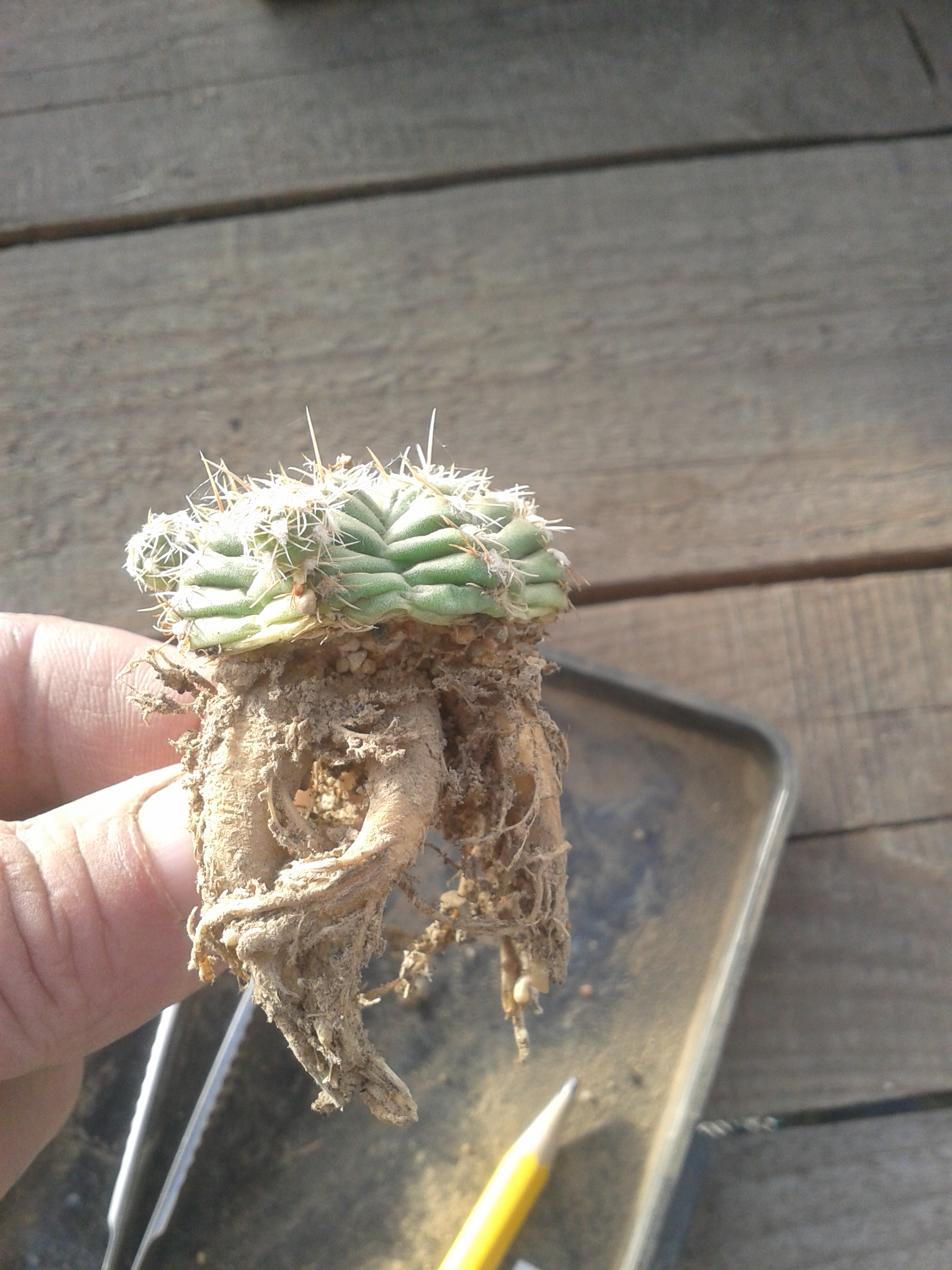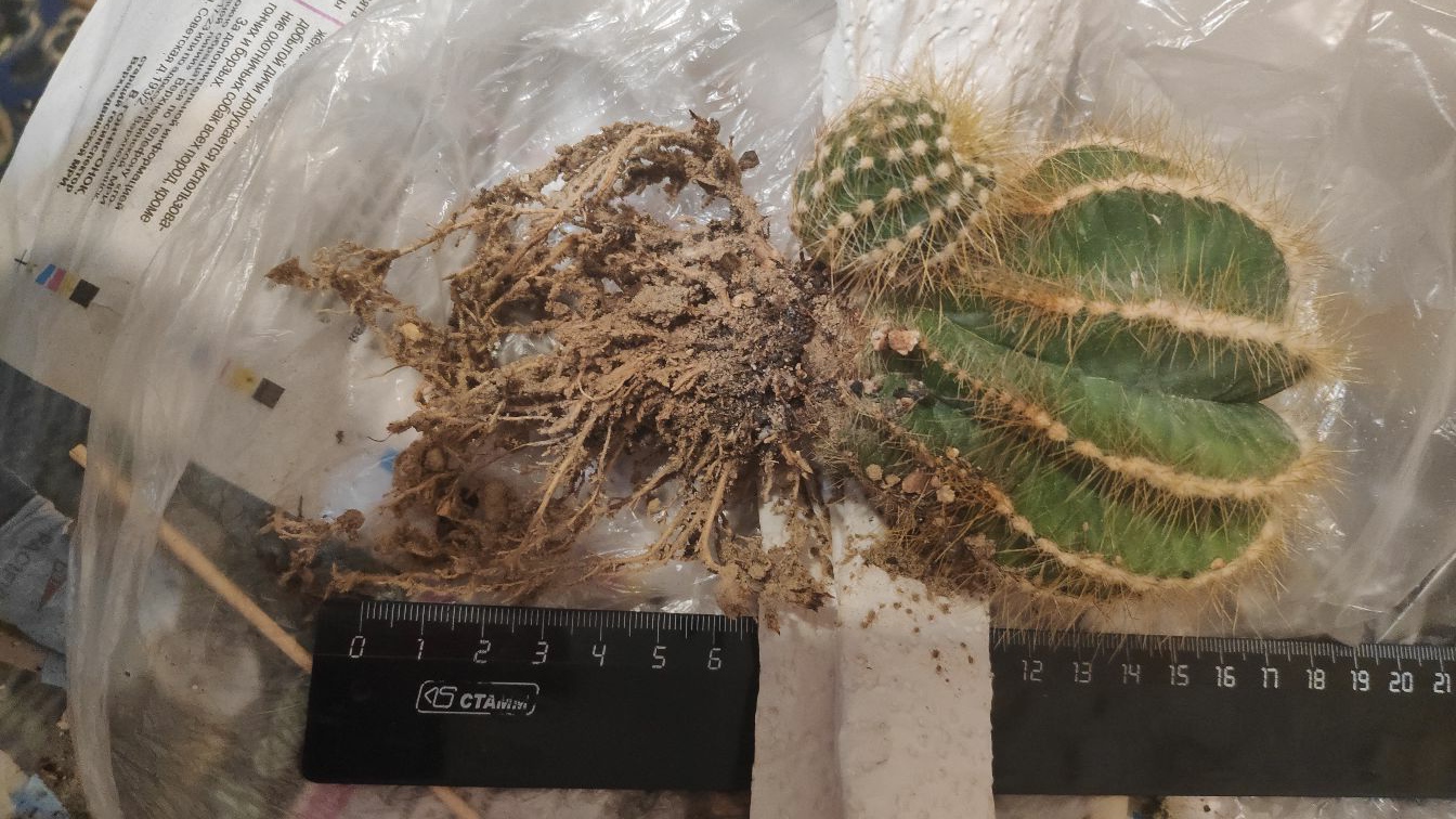 Выкопал мелокактус и 2 чилийца. У чилийцев всё в порядке. У мелокактуса не корень мочкой, а какой-то одубевший ствол, с мелкой мочкой типо мышиного хвостика внизу.