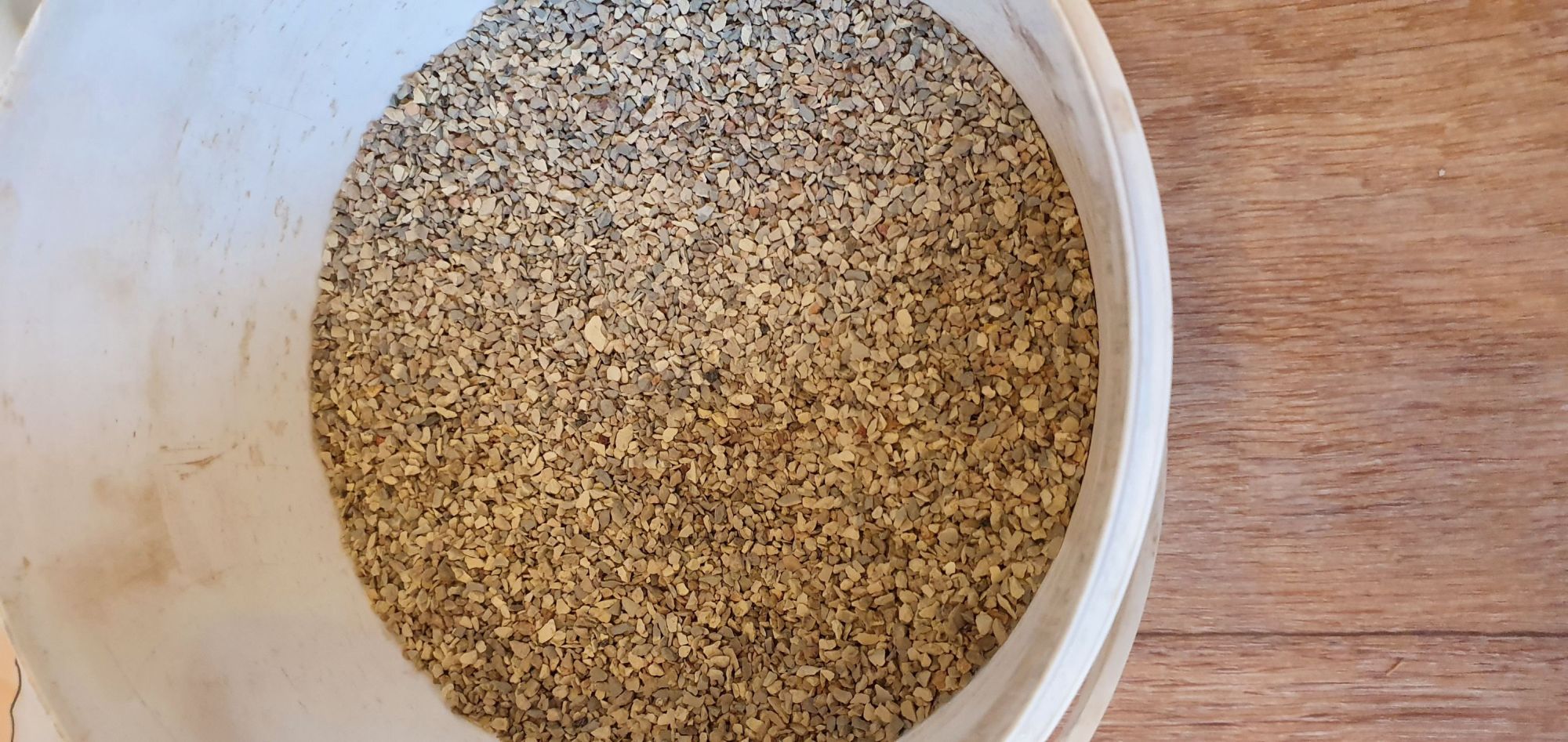 Замачивание в горячей воде на 4 часа - никаких изменений, остался твердым. Пыльноватый, но промывается оч быстро, не так, как в случае со смывание верхнего слоя, именно пыль вымывается. По виду - как раз что-то типа акадамы/канумы, фрация 0,5-5 мм. Буду пробовать. Промою, прожарю, просею по фракциям и добавлю к своей гравийке (не ко всей конечно) В частности, к посевной смеси добавлю мелкую фракцию, воду набирает хорошо, 117гр после промачивания весили 196, характерное шипение при поливе есть, т.е. хорошая пористость. Завтра еще начну тест по скорости просыхания в моих горшках.