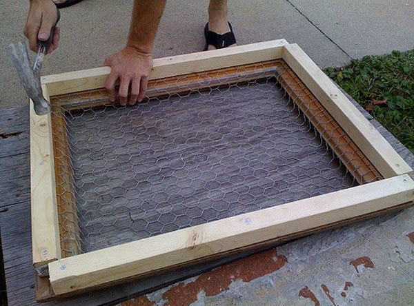 Возьмите металлическую сетку с ячейками среднего размера (сантиметра 2). Прибейте её по периметру рамки гвоздиками или мебельным степлером.