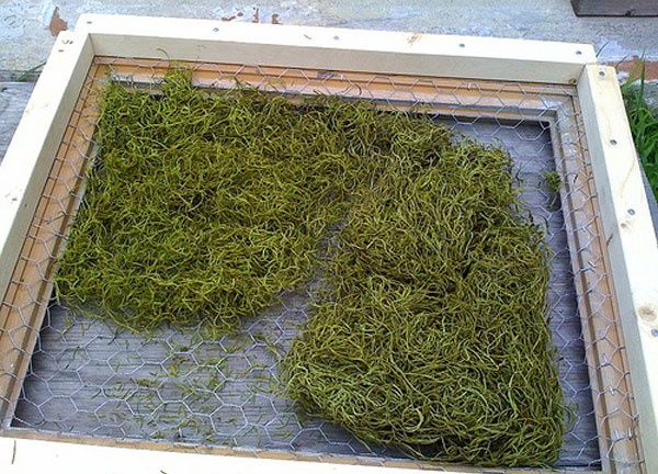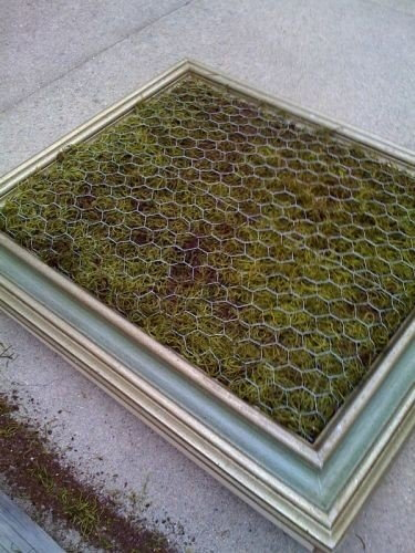 4. На сетку кладём дренаж, который предотвратит высыпание земли, когда "картина" будет повешена вертикально. В данном случае использована подсушенная трава, но я бы лучше взяла какой-то нетканый материал типа геотекстиля.