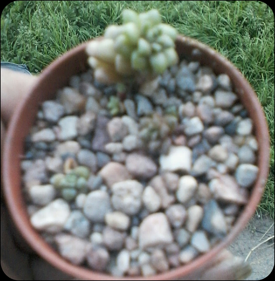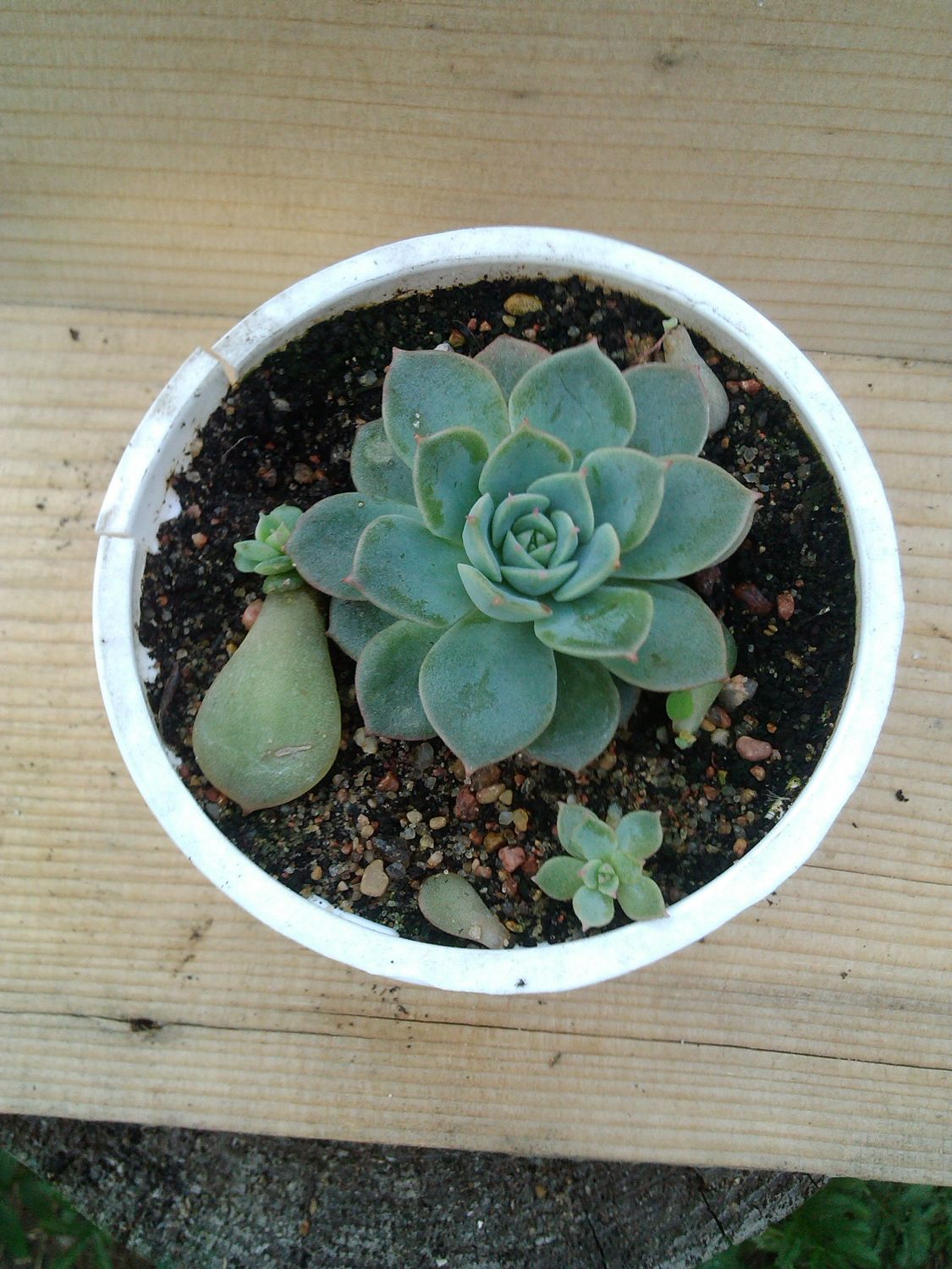 Вы имеете в виду то, что укоренилось и дало маленькие листочки? Вверху - какая-то эхеверия. Возможно, классическая Echeveria Glauca.