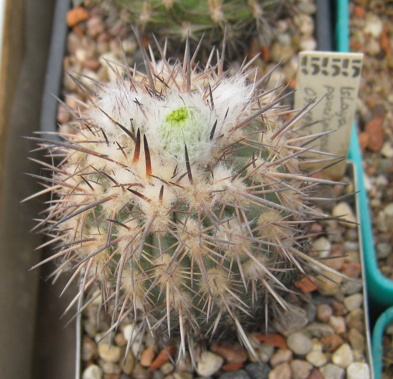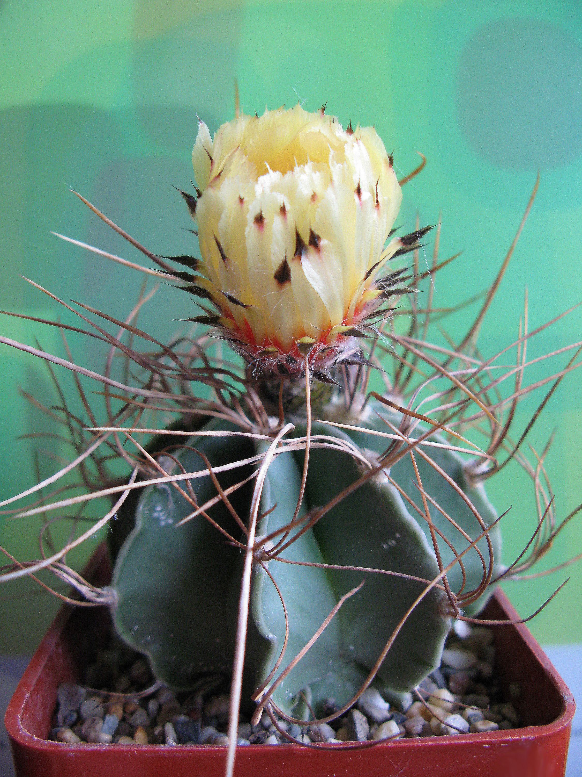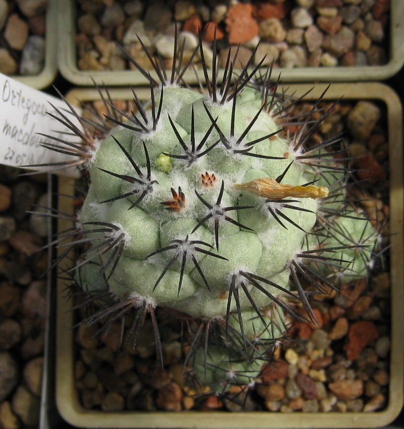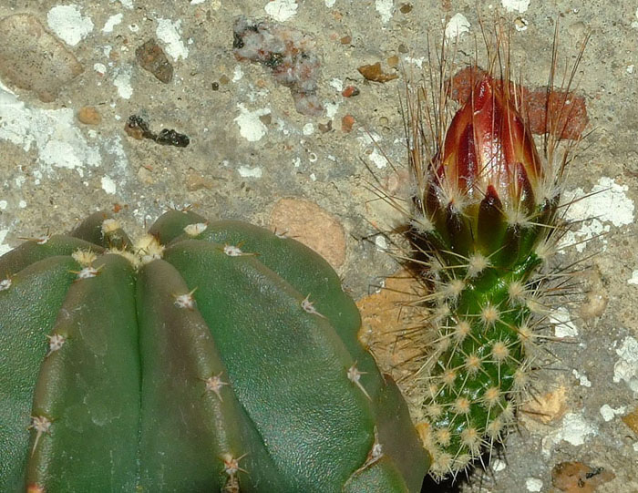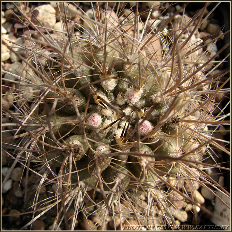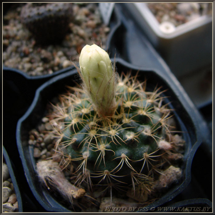 Стебель коротко-цилиндрический, светло-зеленый, с 12-13 ребрами. Ареолы крупные, белоопушенные. Радиальных колючек 7. Центральных колючек 1-4, до 3 см длиной, черных, блестящих. Цветки до 4 см длиной и в диаметре, кремово-белые.Основные отличия, это 15 ребер у моей, и цветки - не кремово-белые и крупнее... :-x Фото цветка можно увидеть здесь (пост №234): http://kaktus.by/index.php?topic=726.new