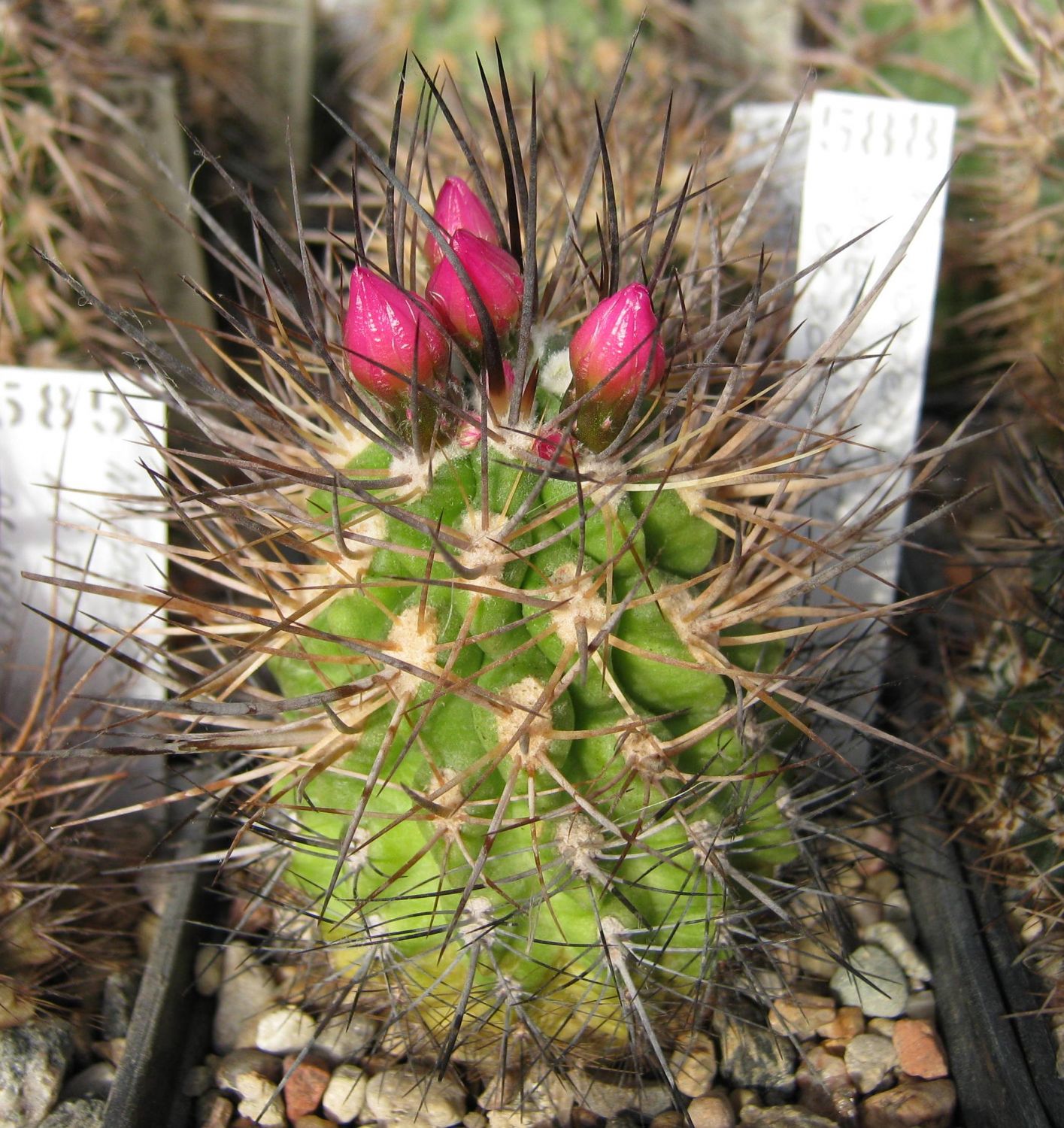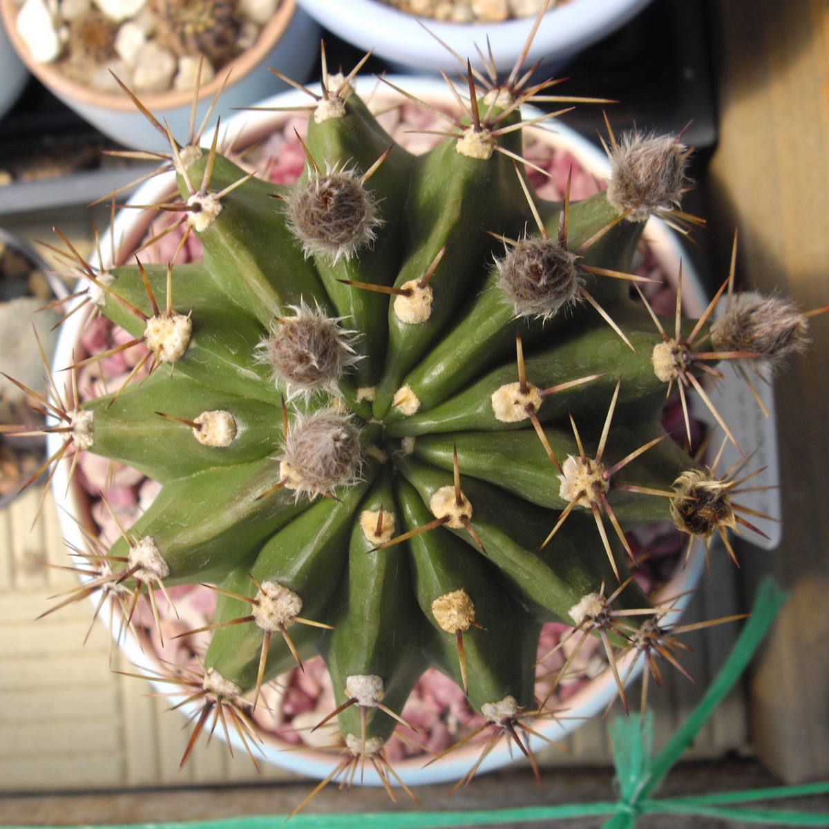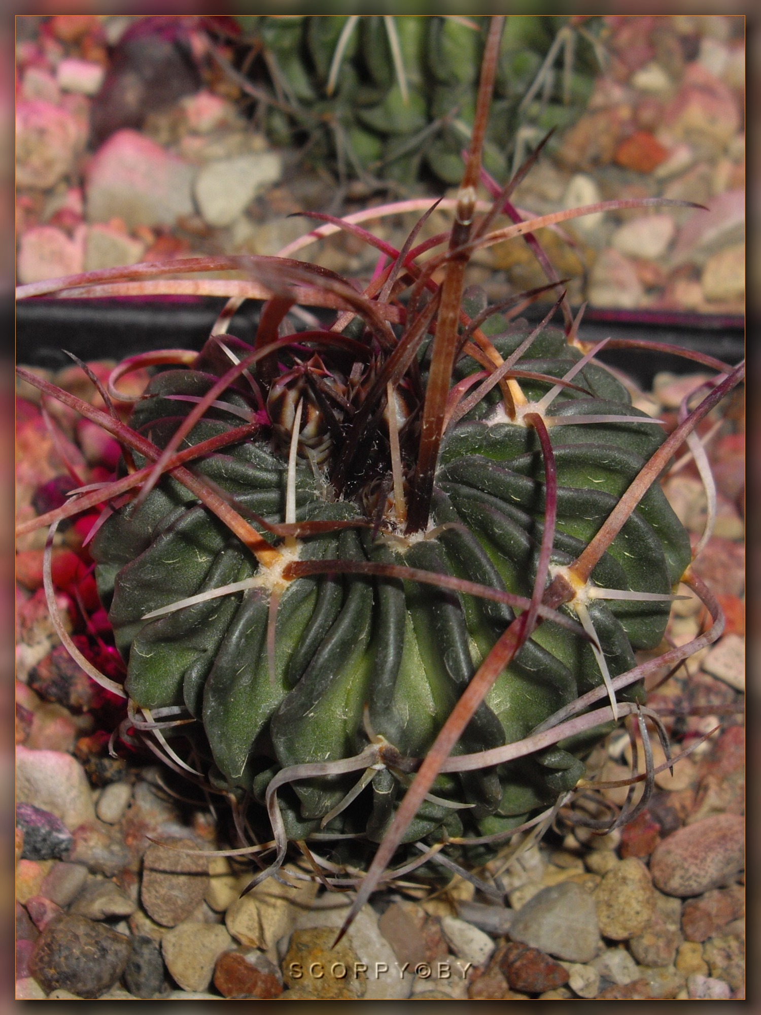 Стебель коротко-цилиндрический, светло-зеленый, с 12-13 ребрами. Ареолы крупные, белоопушенные. Радиальных колючек 7. Центральных колючек 1-4, до 3 см длиной, черных, блестящих. Цветки до 4 см длиной и в диаметре, кремово-белые.Основные отличия, это 15 ребер у моей, и цветки - не кремово-белые и крупнее... :-x Фото цветка можно увидеть здесь (пост №234): http://kaktus.by/index.php?topic=726.new