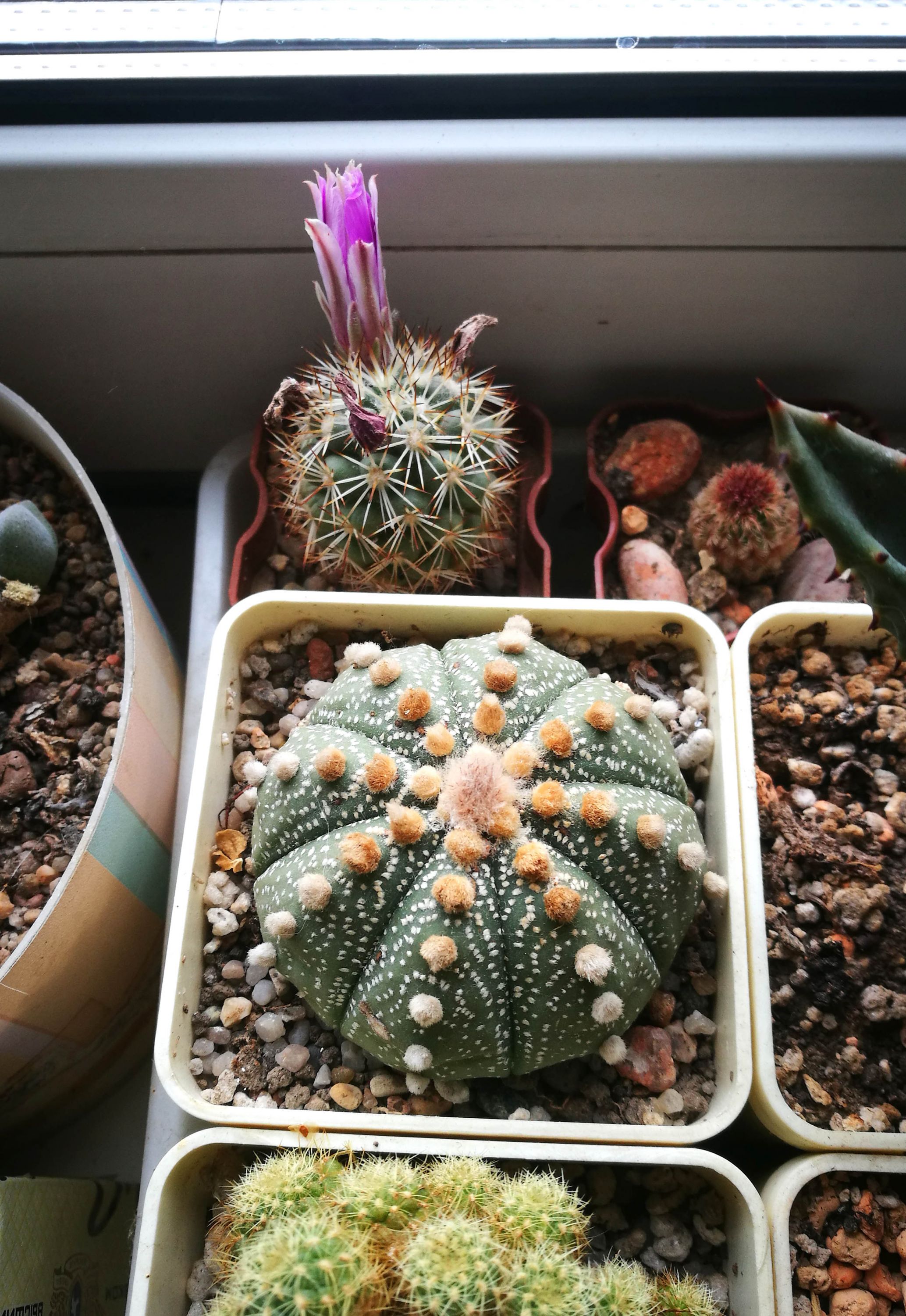 Astrophytum asterias и Matucana madisoniorum v. asterium. Родственники, однако :)Окно выходит ровненько на юг. Матукана стоит очень близко к окну. Бутон идёт под углом 30° к горизонту. Когда цветок раскроется, цветочная трубка ляжет практически параллельно горизонту. В теплице у такой же матуканы цветы выходят практически вертикально. Вот, и думайте, насколько меньше света на подоконнике... :-x