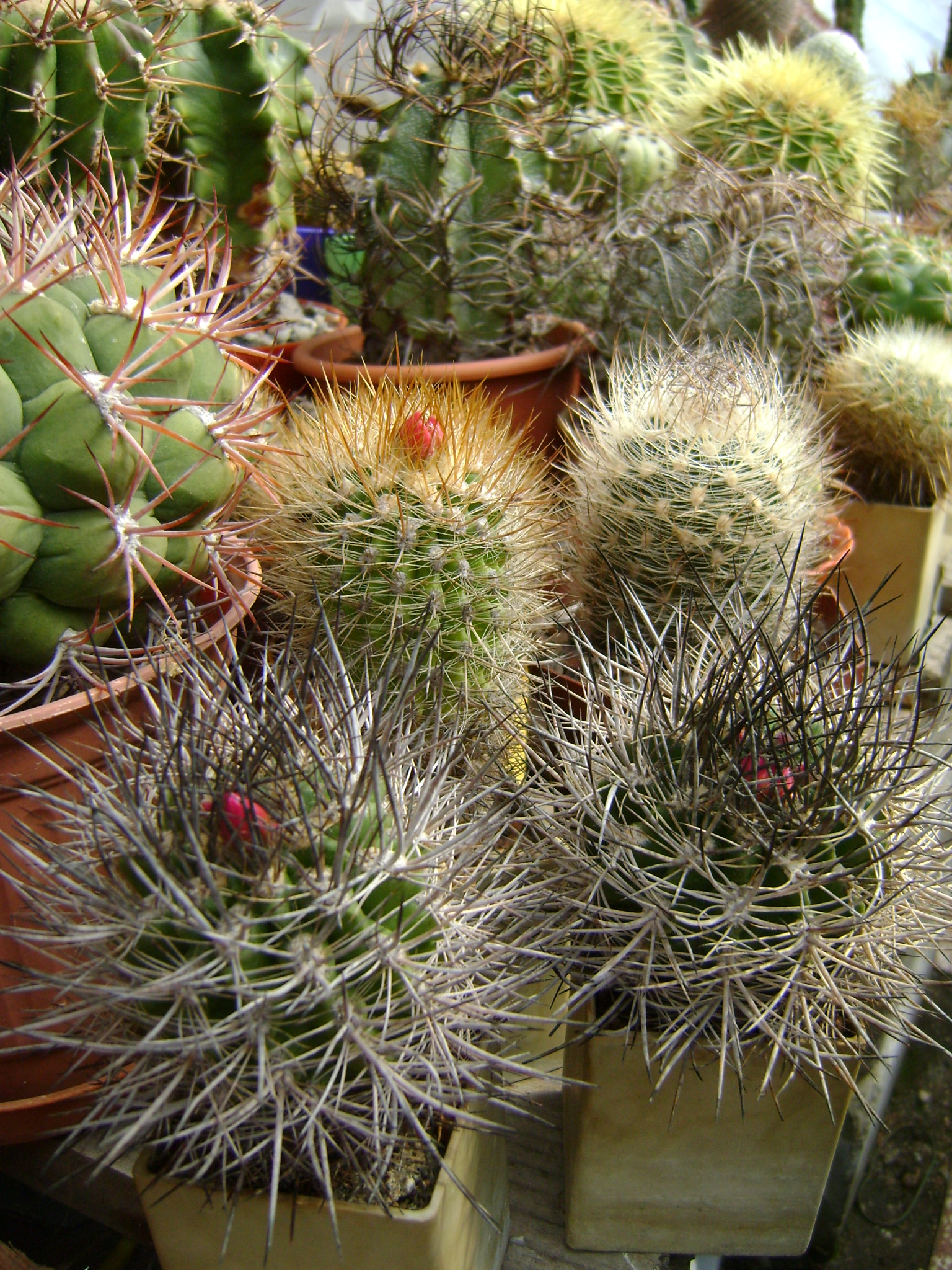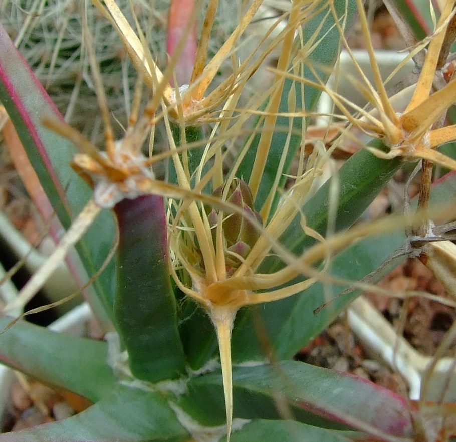 Первая попытка зацвести. Stenocactus. А как дальше не знаю.Stenocactus - одни из самых любимых мной кактусов. Мощные, разнообразные и разноцветные колючки, плюс оригинальный стебель делает их неотразимыми. Жаль, что с определением видов сложновато. Слишком уж вариабельны. Только S. coptonogonus не спутаешь с другими. По поводу Ваших фосулов предполагаю, что первый является S. phyllacanthus, т.к. имею подобный, т.е. наклоненная верхняя широкая колючка и цк трехгранная, только у моего покороче.